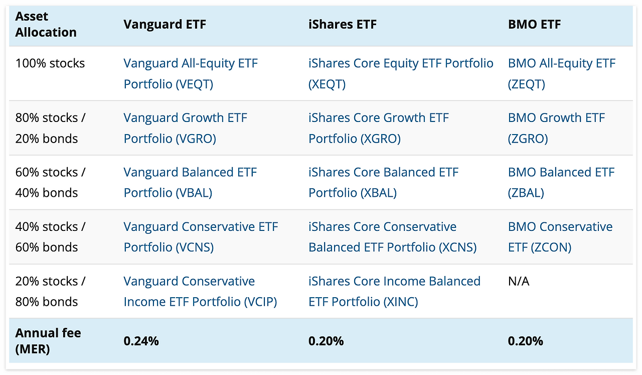 자. 다음 테이블을 보고 아무거나 골라 잡아도 된다. 연간 수수료를 보고 골라 잡아도 된다. 괄호 안에 있는 티커를 보고 마음에 드는 ETF를 (예: VEQT) 사서 RRSP, TFSA, RESP 주식 계좌에 넣어두면 된다.