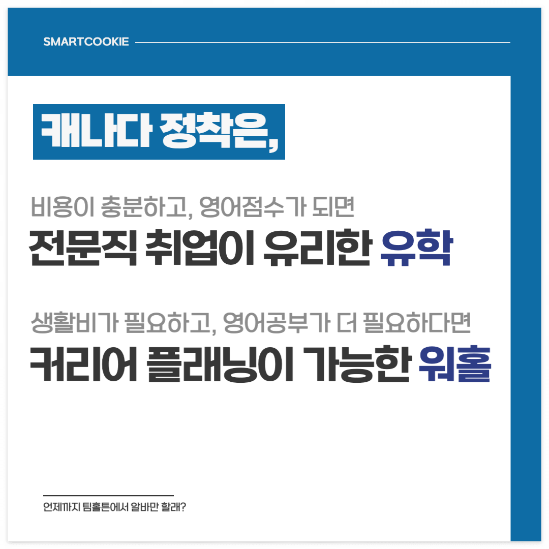 이런 점에서 커리어플래닝이 가능한 워홀의 장점도 충분하다. 정착금 외에 생활비가 꾸준히 필요하고, 영어공부가 좀 더 필요하다면 워홀이 정답이다. 제대로 된 커리어 플래닝을 통해 최종목표 설정. 최종목표에 도달하기 위한 중간목표를 설정하고 도전해야 한다.