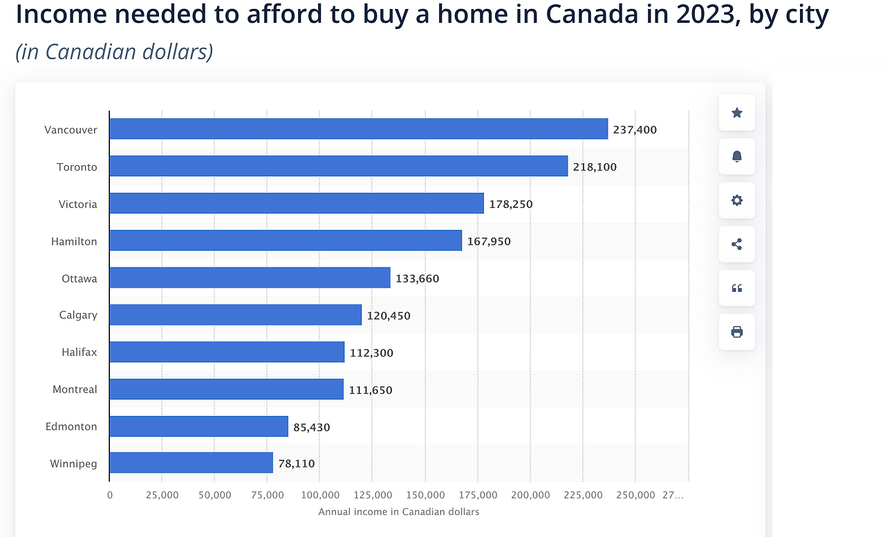 캐나다에서 집 구매 시 필요한 연봉 (도시 별, 2023년) - statista.com 제공