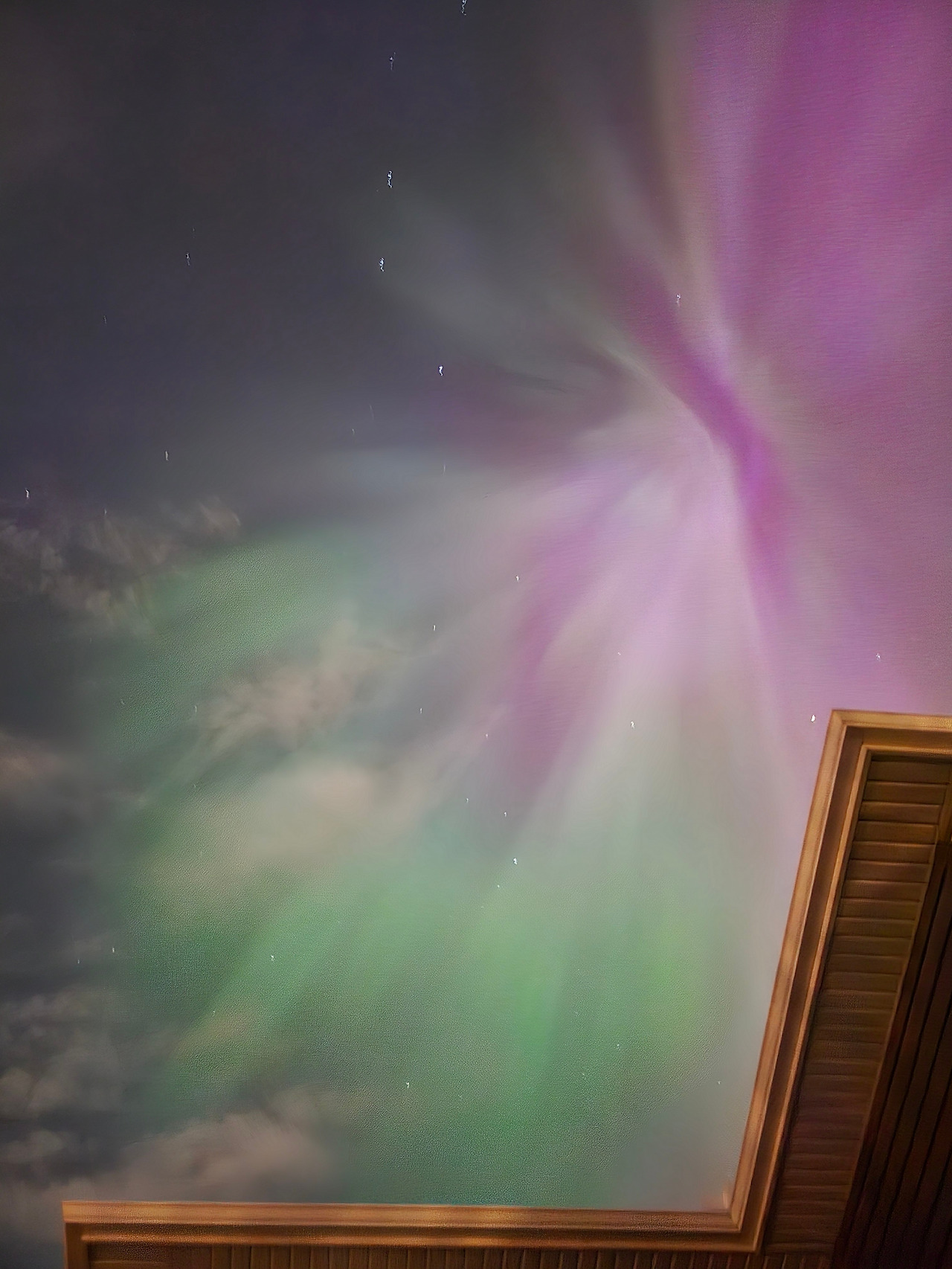 오로라. 오로라를 드디어 만났다. 그것도 집에서! 정말 말이 안 나왔다. 가장 흔하다는 녹색과, 보기 힘든 분홍, 보라색. 눈으로 보는 건 사진에 찍힌 것처럼 강렬하진 않았지만. 드디어 오로라를 만났다는 기쁨에, 눈으로 카메라로 연신 오로라를 담았다. 카메라 안에서도 시시각각 변하는 오로라 때문에 내가 반팔을 입었다는 사실도 잊고 연신 사진을 찍었다.