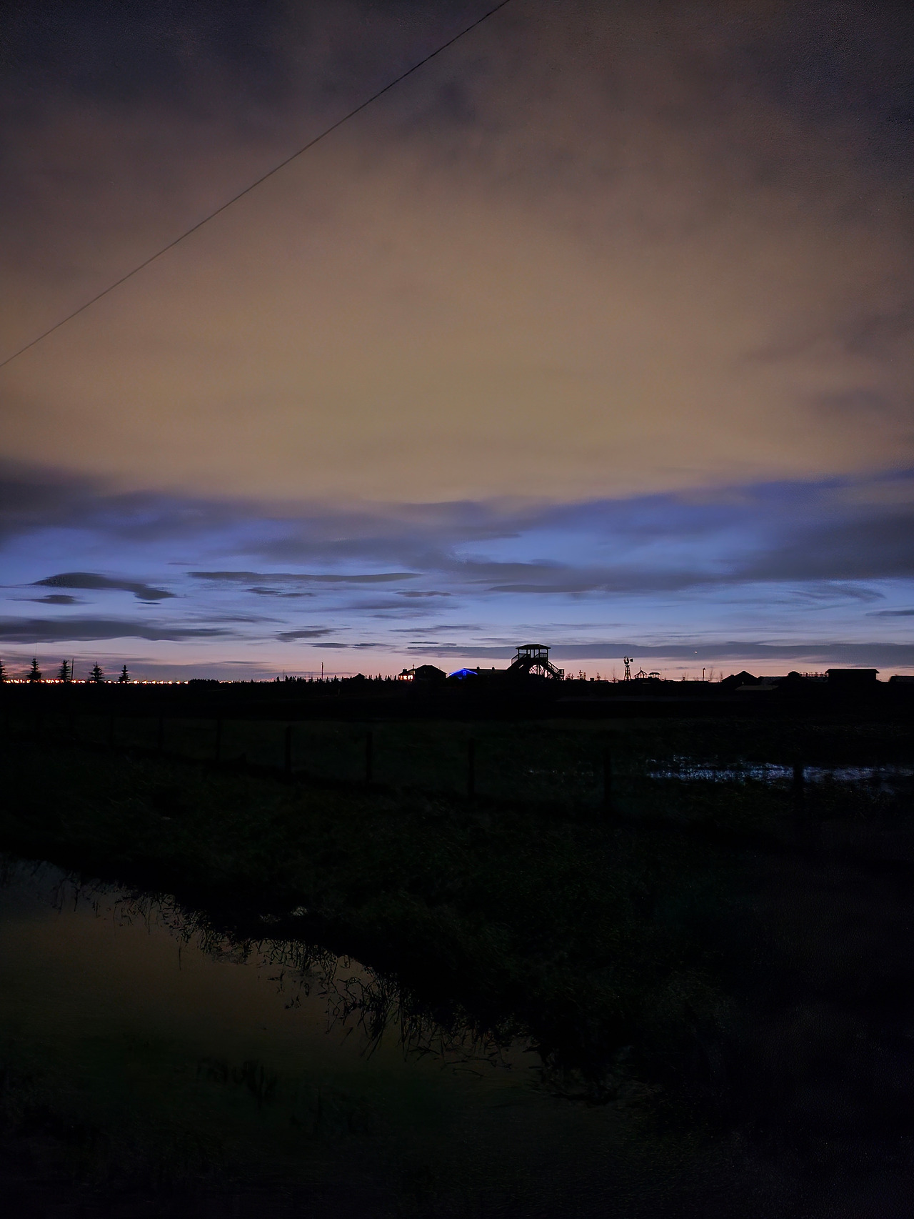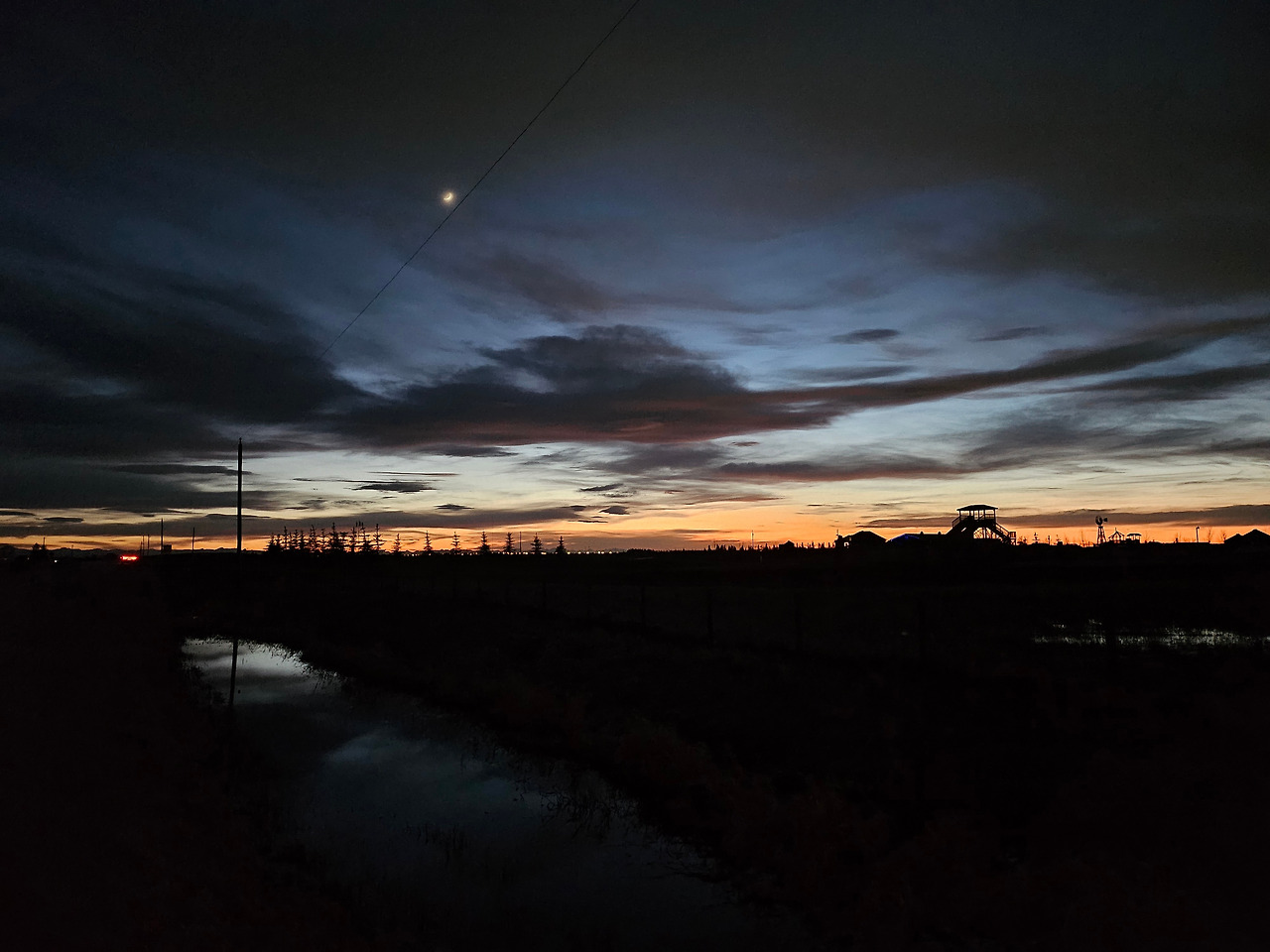 그런데 하늘이 점차 구름으로 뒤덮여갔다. 구름 색을 보면, 너머에 오로라가 떠 있는 게 분명한 것 같은데. 결국 초승달 마저 가린 구름 때문에 오로라를 볼 길이 없을 것 같았다. 잠잘 시간이 한참 지난 애들이 차가 불편하다며 칭얼거리기 시작했고. 오로라를 쫓으러 나온 지 한 시간도 채 안 돼서 집으로 돌아가기로 했다. 확률은 95%지만 구름 때문에 안 보이는 거겠지.... 하며.
