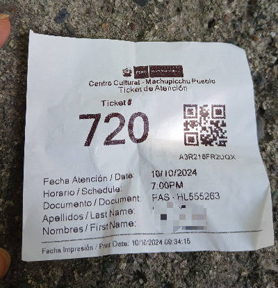 우리는 3개월 전에 마추픽추 Circuit3을 통해 Huayna Picchu를 함께 갈 수 있는 티켓을 TripAdvisor를 통해 구매했다. Huayna Picchu 티켓은 하루에 200명 인원으로 제한하고 (9시 12시 100명씩 입장), 마추픽추와 Huayna Picchu를 함께 입장할 수 있는 티겟이어서 빨리 sold-out 되는 입장권이다. 하지만 마추픽추만 보기에는 뷰가 가장 좋다는 Circuit 2 티켓을 혹시 구할 수 있을까 하는 바램을 안고 아침 일찍 Agus Calientes에 들어갔다. 마추픽추는 하루에 관광객을 이천 명만 받지만 이중 1000장의 티켓은 온라인예매로, 또 다른 1000장의 티켓은 하루전날 Agus Calientes 티켓오피스에서 판매한다. 우리가 9시 30 분쯤 티켓 오피스에 도착해 받은 번호표는 720번. 우리 앞에 719명이 이미 번호표를 끊었고 인기 있는 Circuit2를 받기 위해서는 200번 안쪽의 번호표를 받아야 한다는 것을 info직원을 통해 알게 되었다. 그래서 발급받은 720번 번호표는 과감히 쓰레기통에 버렸다. 그리고 우리가 예약한 티켓을 최대한 활용해서 내일 마추픽추를 즐기자고 맘먹었다. 나중에 알게 된 사실이지만 새벽 3시 반에 와서 티켓 오피스 앞에 줄을 서서 50번 번호표를 받았다는 포스팅을 읽었다. 9시 반에 도착한 우리가 720번 번호표를 받은 것은 당연한 일이었다.