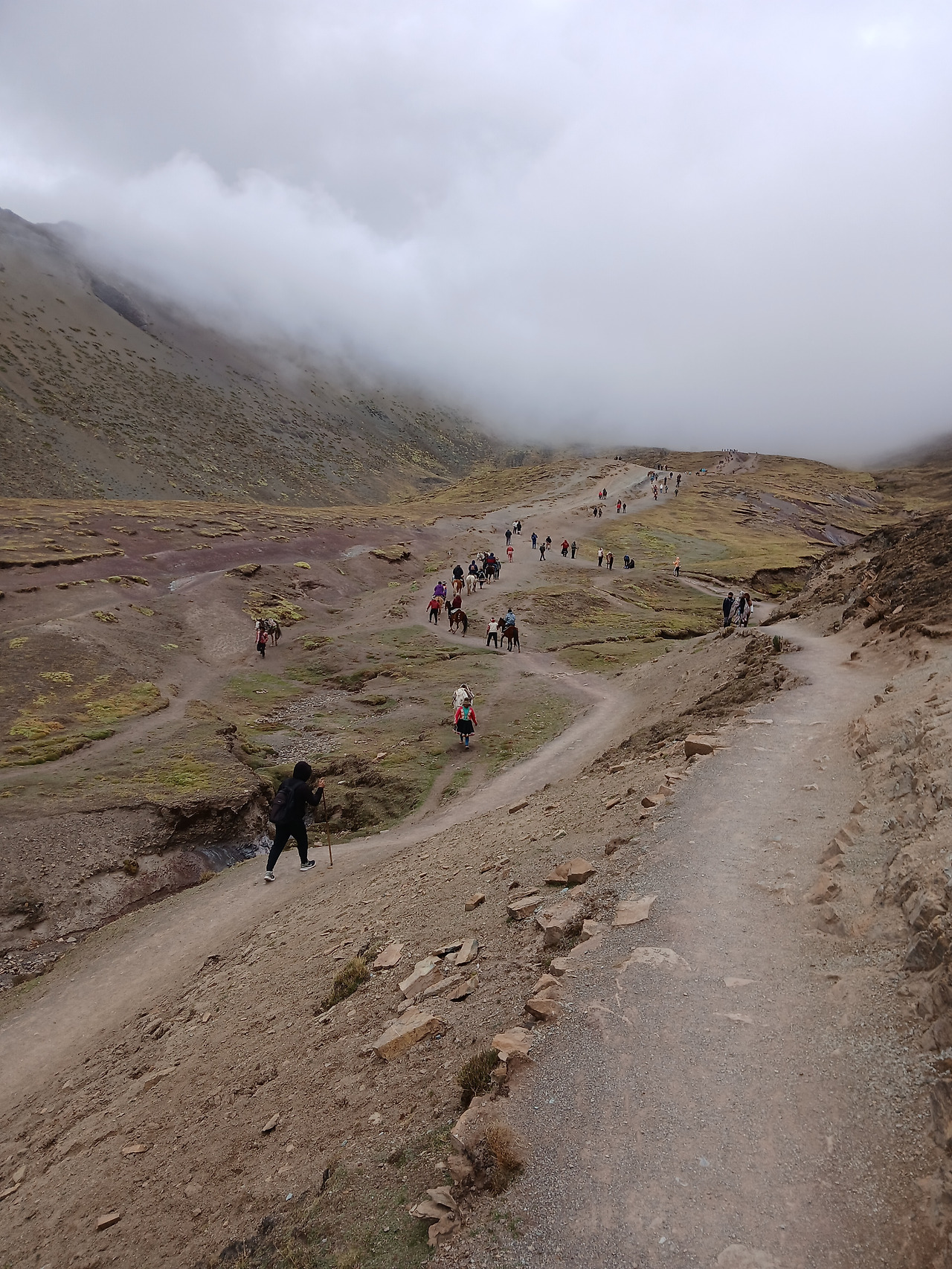 주차장에 내려 가이드로부터 주의 사항을 듣고 하이킹 스틱을 하나씩 지급받았다. 무지개 산 쪽을 올려다보니 경사가 심하지 않아 스틱은 우리에겐 짐이 될게 뻔했다. 그래서 필요 없다고 돌려주었더니 가이드가 고개를 갸웃거렸다. 무지개산을 만나려면 주차장에서 출발해 1.5km, 한 시간 반정도의 산행을 해야 했다. 산행이 어려운 관광객들을 위해 말 (70 솔), ATV (90 솔)로 무지개산까지 태워주는 서비스도 있었다. 1.5km의 한 시간 반짜리 산행은 록키하이커인 우리들에게 식은 죽 먹기였지만, 해발 5,000미터에서의 산행은 완전 다른 스토리였다. 숨을 아무리 깊게 쉬어도 숨이 목까지밖에 안 쉬어지는 얕은 숨을 자주 쉬어야 했다. 우리 일행 중 20대 젊은 남자 청년은 고산병이 심하게 와서 버스에서 아예 내리지 못하고 버스에서 일행을 기다리며 여행 내내 매우 힘들어했다.