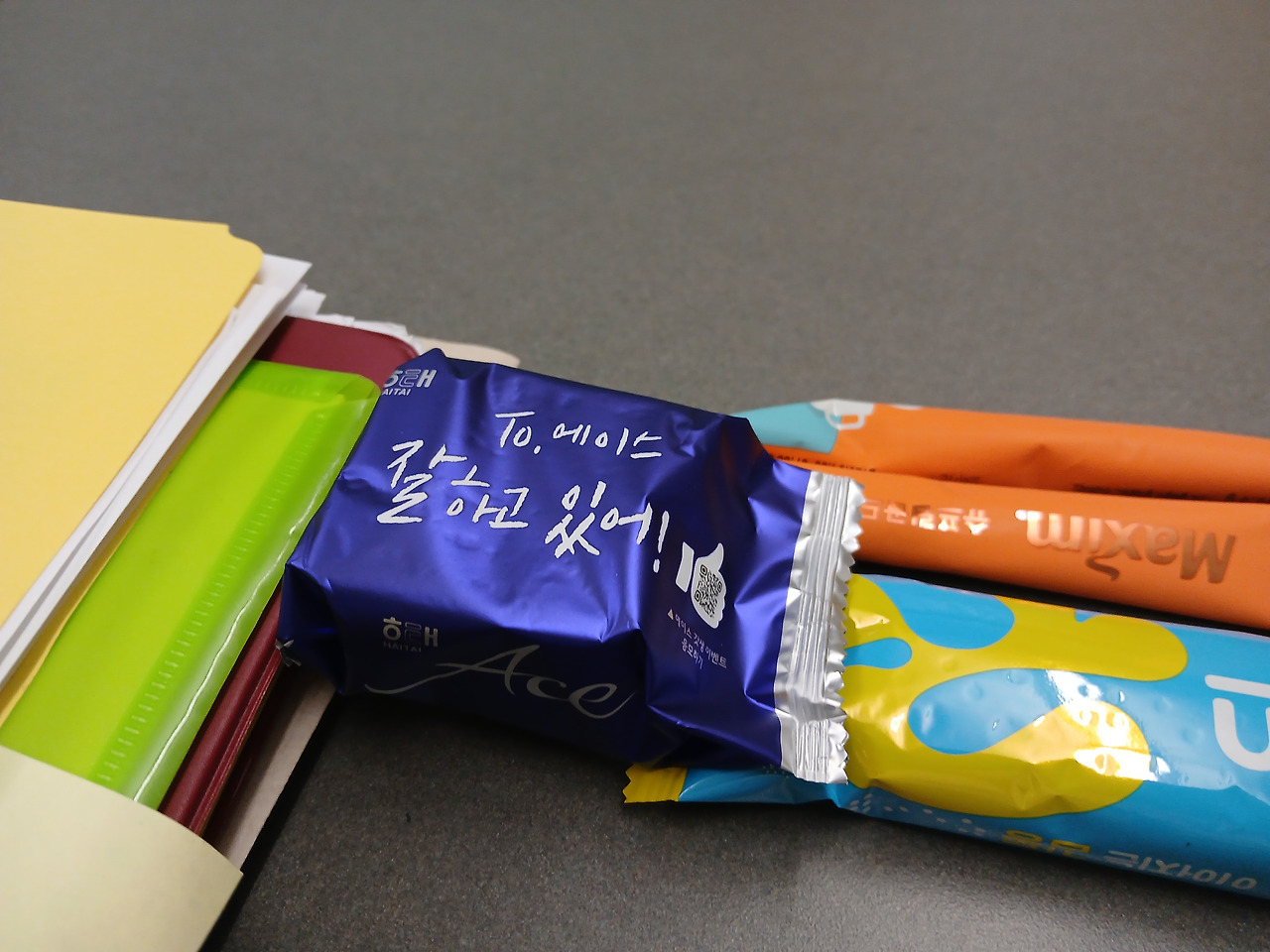 모닝커피와 함께 먹으려고 도시락 가방에 에이스 한 봉지를 챙겨왔다.
