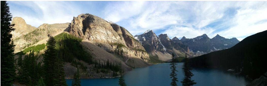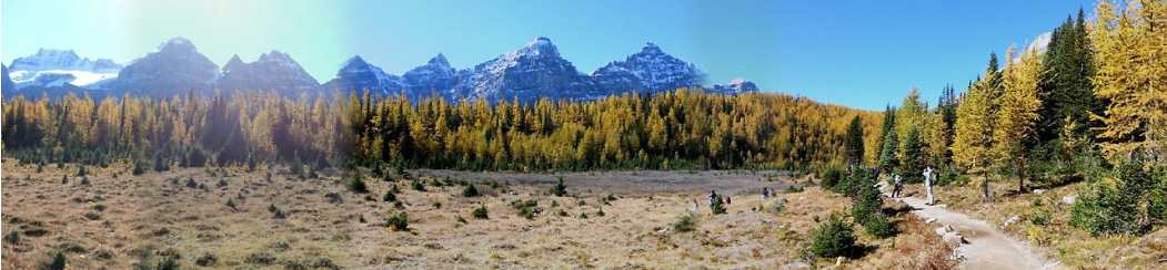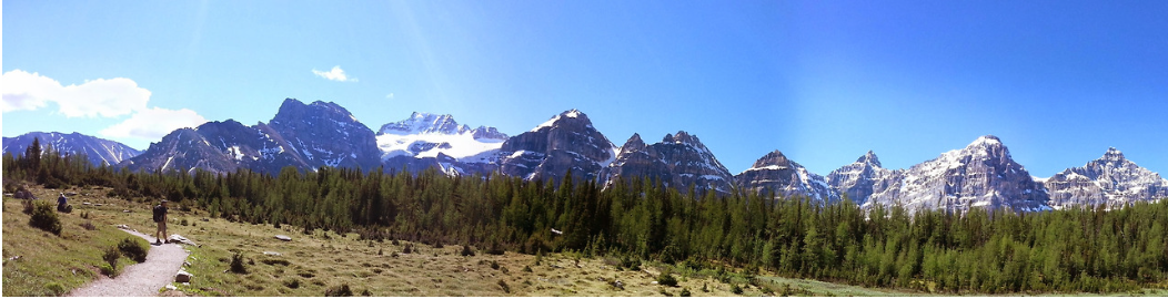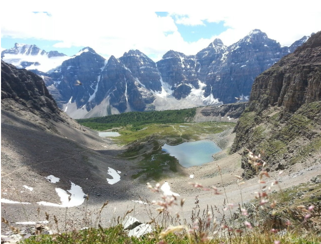 Moraine Lake에서 출발해 헐떡헐떡 오르막 지그재그를 20번 정도 꺾으면 이런 뷰가 기다린다. 갑자기 숲이 열리며 ten peaks가 병풍처럼 펼쳐진다. 가을에는 저 초록 라치들이 노랗게 변해 장관을 이룬다. (9월 중순-9월 하순)