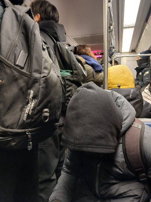 그날 아침, 셔틀에서 내려 Century Park LRT역 (지하가 아닌 지상역)에 걸어 들어가니 이미 엄청난 인파가 열차를 기다리고 있었다. 운행 지연의 신호였다. 영하 30도의 공기 속에서 15분쯤을 기다려, 슬금슬금 기어 오듯 들어오는 열차에 몸을 실었다. 출발역부터 열차 내부는 발 디딜 틈이 없었다. 간신히 자리를 잡고 꽁꽁 얼은 손과 발을 녹이는 중이었다. LRT는 다음 역인 Southgate 역으로 가는 동안 10번도 넘게 멈췄다. 걸어가도 이것보단 빠를 것 같았다.