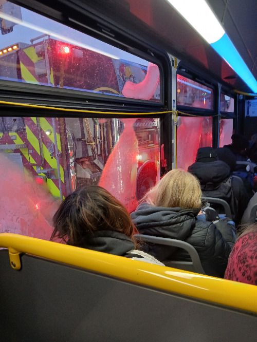 승객들은 일제히 열차에서 내려 버스 승강장으로 향했다. 열차의 양 끝에 타서 버스 승강장에 먼저 도착한 승객들은 정차해 있던 University Express나 4번 버스를 잡아탔다. 그러나 어디에도 비상 대체 버스는 없었고 ETS (Edmonton Transit System) 직원도 보이지 않았다. 이 추운 날, 수백 명의 승객들은 각자도생 바로 그 자체였다.