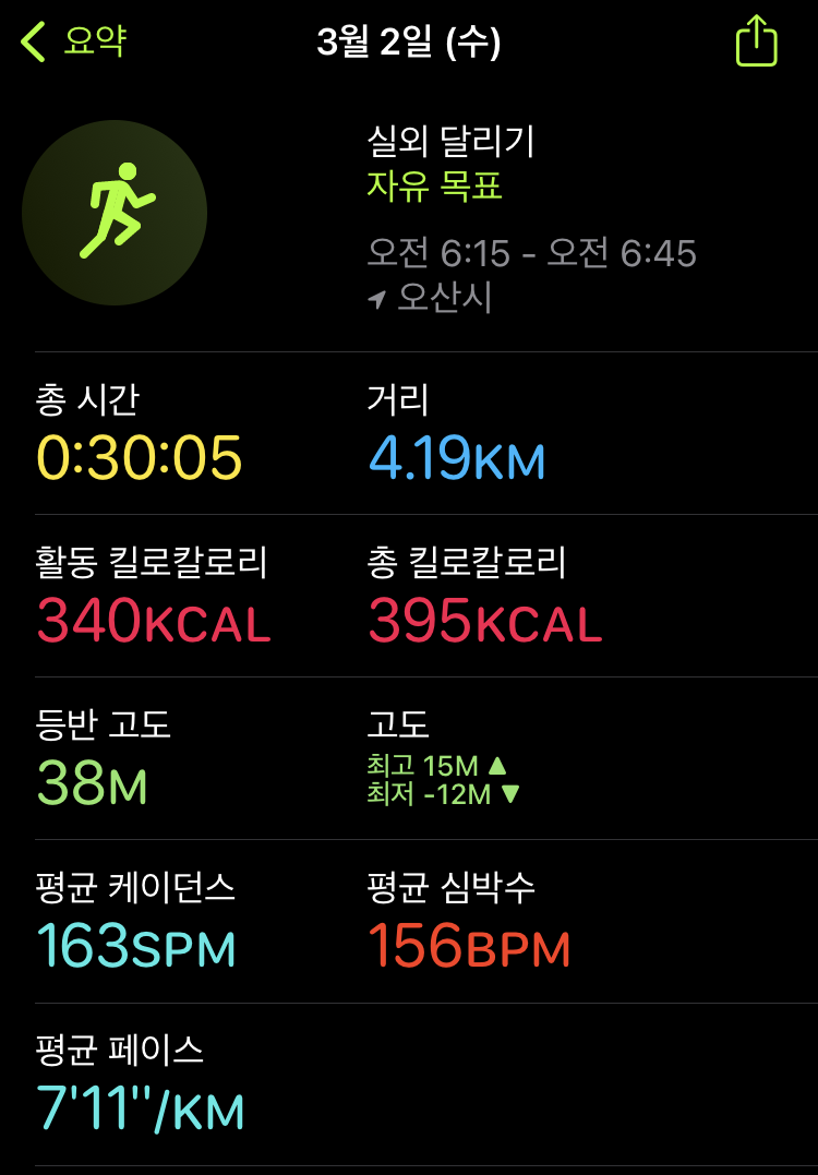 상쾌하게 새벽러닝을 했다. 속도와 기록에 연연하지 않고 옆사람과 대화를 할 수 있을 정도의 심박을 유지하며 쉬지않고 달리자. 라고 의식을 하며 달렸다.