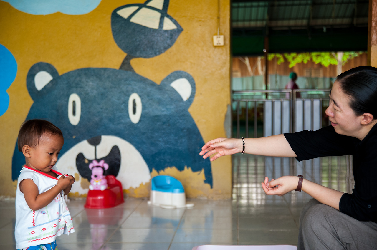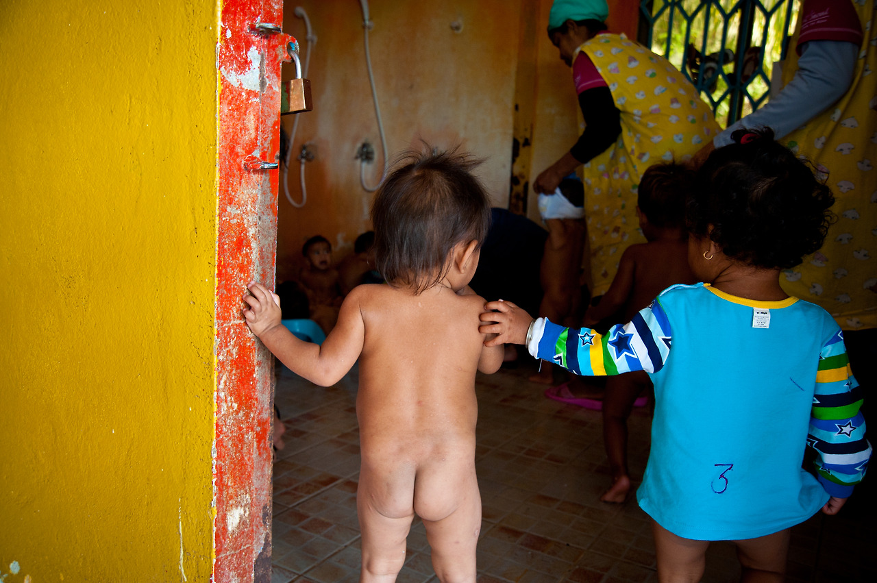 It's a usual bath time, but 'Srey Nut' hesitates to enter the bathroom.