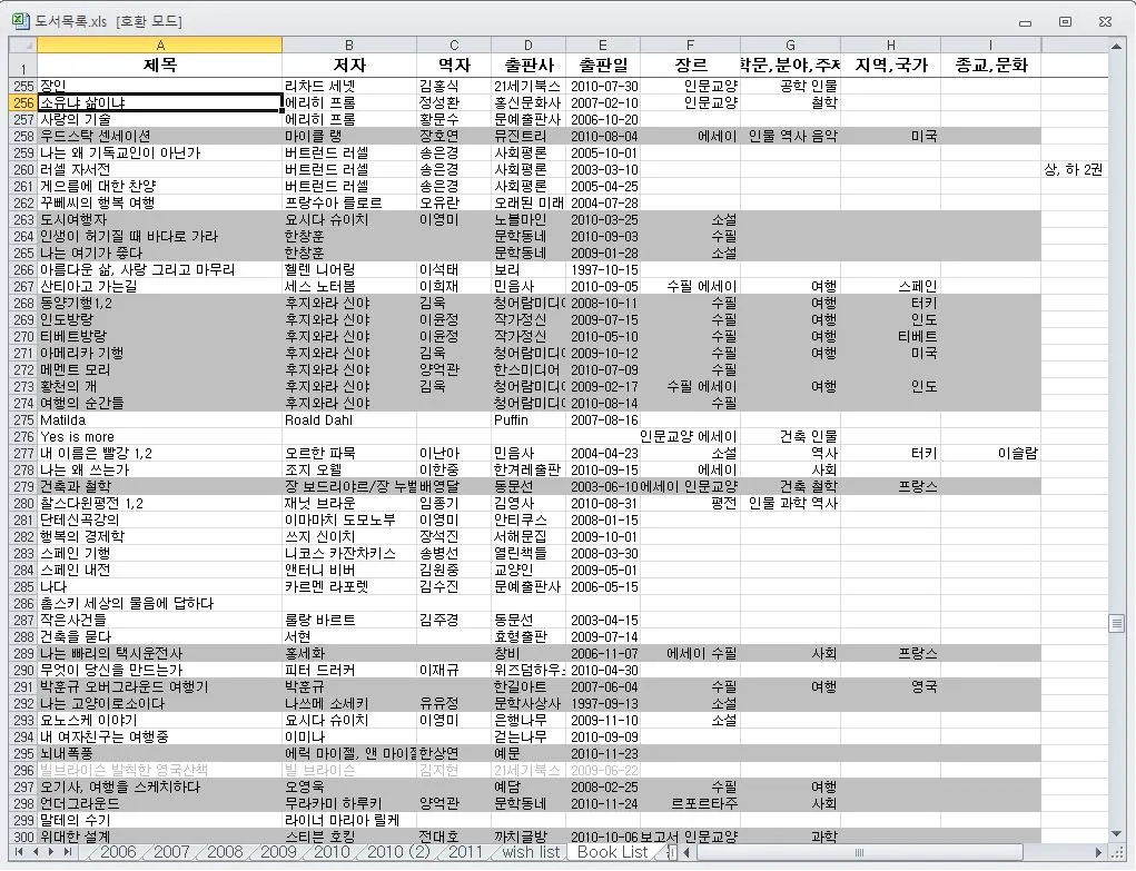 그 대신 엑셀표를 하나 만들었다. 내가 읽은 책들의 목록을 작성하기 시작했다. 산 책이든 서점에서 읽은 책이든 모두 기록할 수 있으니 나만의 서재는 이 엑셀 시트가 될 거라 생각했다. 제목, 저자, 역자, 출판사, 출판일 등의 칸을 만들어 기록했다. 나만의 분류코드도 만들어 책마다 분류코드도 지정했다. 딸이 태어나자 책 읽을 시간도 없어져 이마저도 그만두었지만, 그 당시에는 진지했다.