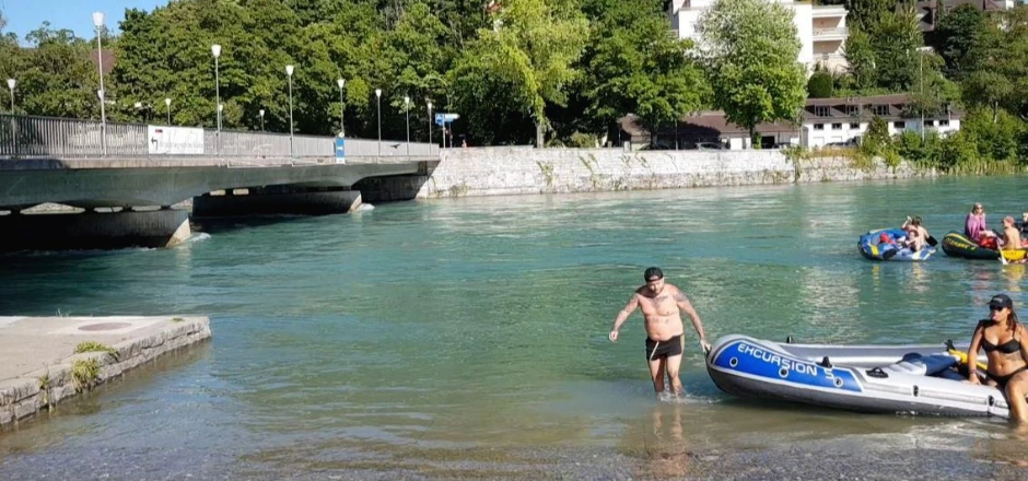 K부장의 안내로 강변으로 내려갔다. 스위스 연방 궁전의 옆 길로 들어가면 강 쪽으로 내려가는 케이블 철도-리스본의 언덕지형을 오르내리는 푸니쿨라와 비슷한 형태의-가 있었다. 대중교통의 성지답게, 스위스 패스만 있으면 누구나 이용 가능했다. 다시 한번 이 나라의 대중교통에 감탄하며 강가로 다가갔을 때, 더욱 감탄할 만한 광경을 목격했다. 사람들이 강에서 고무보트를 타고, 수영을 하고 있던 것이다.