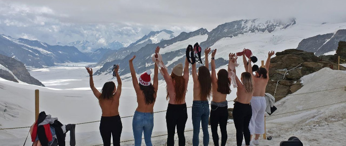 이 감탄과 경의를, 온몸으로 표현하는 무리가 있었다. 야외 전망대인 고원지대(Plateau)에서 스위스 국기를 붙들고 인증 사진을 찍을 때였다. 예닐곱 명의 이십 대 여성이 알레취 빙하를 향해 일렬로 섰다. 그리고 주섬주섬 웃옷을 벗기 시작했다. 7월이지만 이 곳의 기온은 영하다. 그런데 티셔츠까지 벗는다. 하하, 젊구나, 생각하는데, 급기야 가슴을 가리던 브래지어까지 풀었다. 곳곳에서 환호성이 나왔다. 이 곳의 온도가 1도쯤 올라가는 순간이었다.