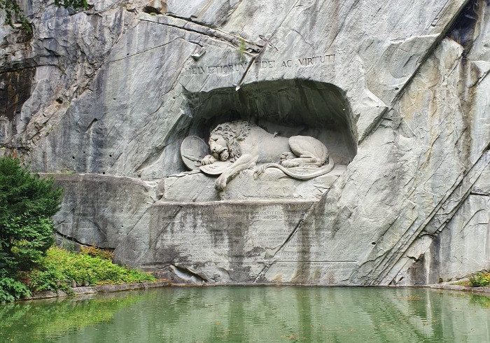 우선 빈사의 사자상을 보러 나섰다. 이 사자상은 프랑스혁명 당시 루이 16세의 트윌리 궁을 지키다가 전사한 스위스 용병들을 기리기 위한 조각상이다. 가난했던 그들의 선조는 그들이 물러설 경우 후손들이 용병을 하지 못하게 될 것을 우려하여 끝까지 퇴각하지 않고 궁을 지켰다. 사자는 밝은 회색빛의 대리석 암벽에 조각되어 있는데, 작은 연못 건너편에 있기 때문에 가까이 다가가서 볼 수는 없다. 하지만, 칼에 찔려 고통스러운 표정으로 죽어가는, 혹은 이미 죽은 사자의 모습은 그 자체로 어떤 울림을 준다. 이 사자상을 보고 마크 트웨인은 이렇게 썼다.