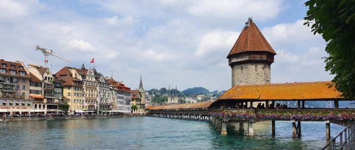 식사를 마치고 우리는 강변을 따라 카펠교까지 갈 수 있었다. 이 우아한 목조 다리는 본래 요새 도시였던 루체른의 방어벽과 방위 탑으로 사용되었다. 튠에서 봤던 다리와 같은 형태이지만 규모가 훨씬 크다. 로이스 강과 카펠교. 가히 루체른의 랜드마크라 할 만하다.