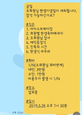 평소 친하게 지내온 내 친구들을 초대했다. 카카오톡으로 아내의 생일 '본 행사' 일정을 보냈다. 사실 이렇게 보내본 건 처음이었다. 준비하는 나도 일단 재미있어야 한다는 생각에 격식?ㅎ을 갖추어 친구를 초대했다. 한 친구는 일이 있어 한 명의 친구만 본 행사에 참석하기로 했다.