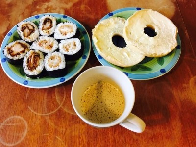다행히 오늘의 날씨는 어제보다 맑다. 산책하기 딱 좋은 날씨다. 시간이 안 가는 것 같은데 어느덧 뉴질랜드에 온지도 17일째다. 오늘은 신랑이 8시 30분까지 출근을 해야 해서 7시에 일어났다. 오늘의 아침은 크림치즈와 함께 토스트 한 베이글과 스시로 해결했다. 스시라고 하긴 민망하기는 하다. 김밥이다. 아, 스시롤이라고 해야 하나?