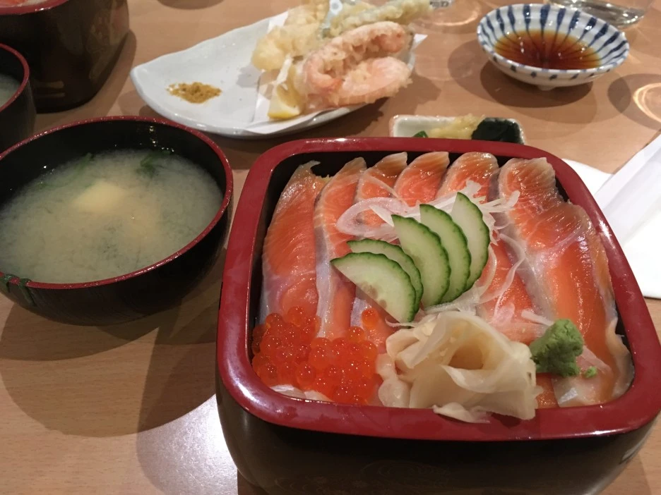 일찍 다음 일정을 할 수도 있었지만 이날 아니면 못 먹을 것 같은 연어덮밥 때문에 6시까지 기다리기로 했다. 그냥 경치가 좋은 곳에 차 세워놓고 책도 보고 핸드폰도 하고 사진도 찍고 신랑은 낮잠도 잤다. 얼마나 기다렸을까. 드디어 오픈한 음식점. 기다리고 기다리던 연어덮밥을 먹었다. 군것질 빼고 먹은 첫끼 식사였다. 브레이크 타임을 가진 뒤 재오픈한 가게에 우리가 1등이었다. 늦은 시간에 방문했더니 바깥 경치가 보이지 않았던 기억이 난다.