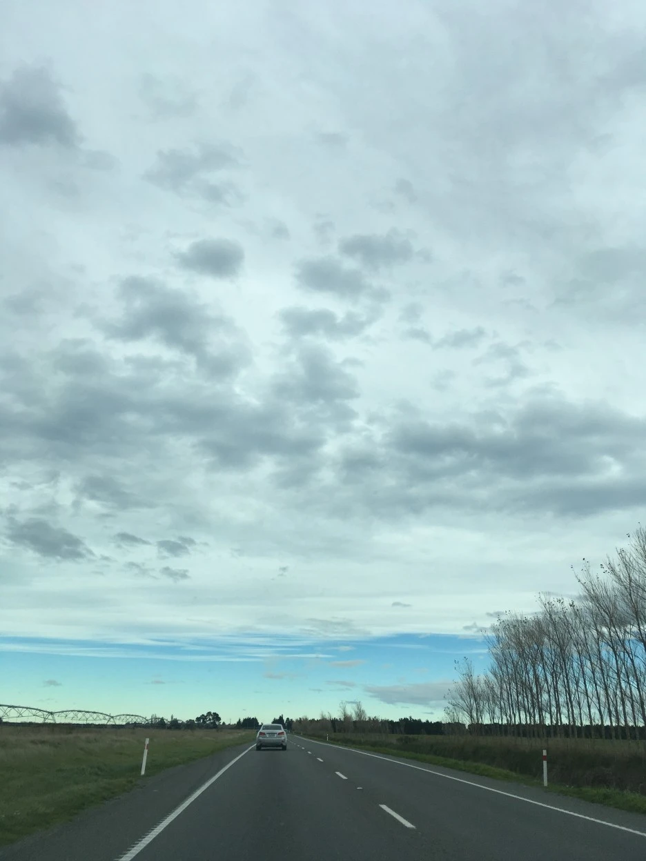중간에 점심을 먹을까 하다가 군것질을 계속하다 보니 배가 별로 안 고픈 것 같아서 달리고 달렸다. 하얀색과 파란색이 공존하는 엄청난 하늘에 사진을 찍고 또 찍으며 달렸다. 뉴질랜드의 뻥 뚫린 길. 정말 내비게이션이 하는 일이 없는 동네다. 몇백 킬로미터 이상을 직진만 하라고 알려준다. 정말 직진만 하다 보면 지루할 법도 한데, 가다가 보이는 양과 소, 푸른 자연이 지루하지 않게 해 준다. 너무 좋았던 기억이다.