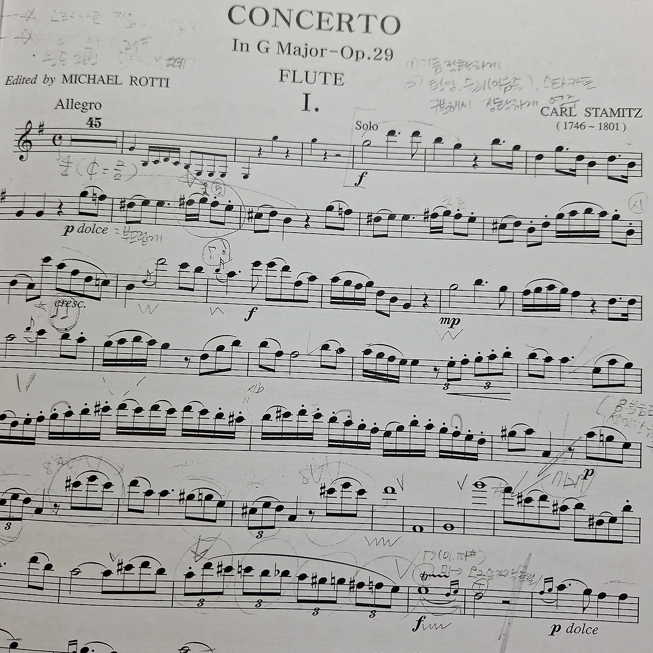요즘 연습하는 곡은 Stamitz 플루트 협주곡 op.29 1악장이다. 2023학년도 선화예중 입시곡이란다.
