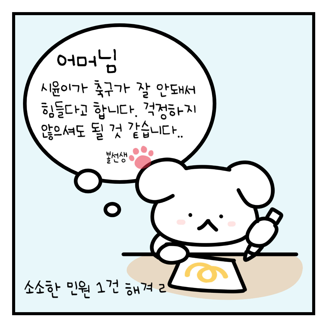 "시윤아, 손흥민 선수도 처음부터 축구를 잘하진 않았어. 연습을 자꾸 하면 너도 잘 할 수 있으니까 걱정하지 마. 알았지?"