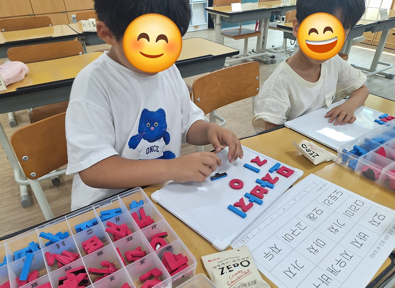 4교시 수업이 있는 수요일마다 한 시간씩 둘을 데리고 한글 공부를 한다. 조금씩 글자를 알아가는 게 아이들도 재미가 있었는지 4교시 수업이 있는 금요일에도 하자고 하기도 한다. 물론 간식의 힘도 크다.