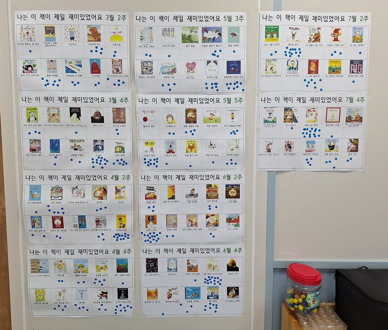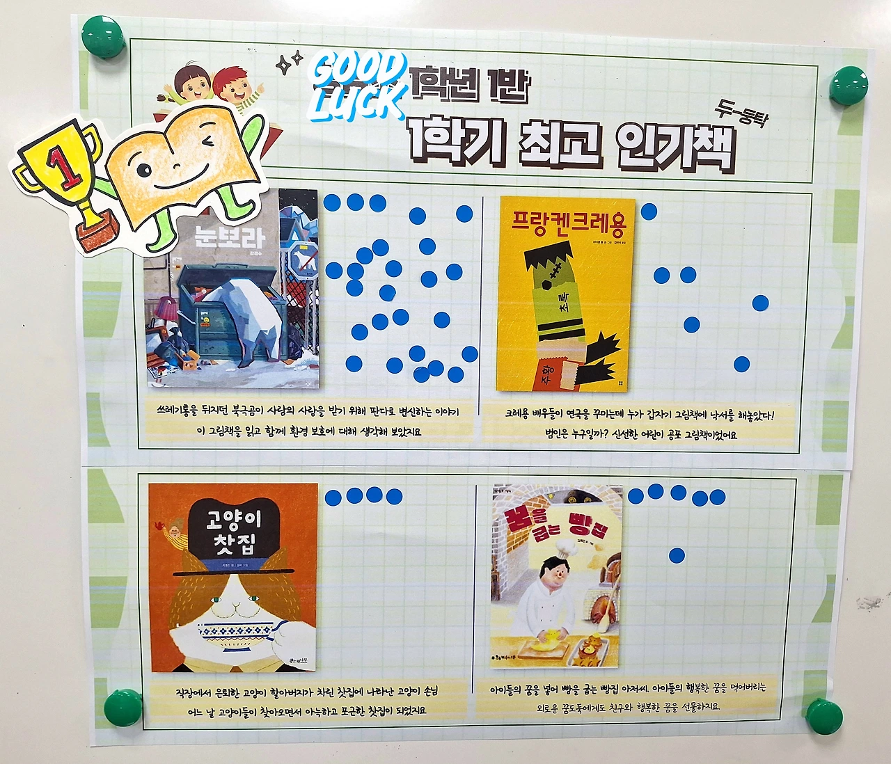 이 중에서 제일 스티커가 많이 붙은 순서대로 4권을 골라 1학기 최고 인기책을 뽑는다.
