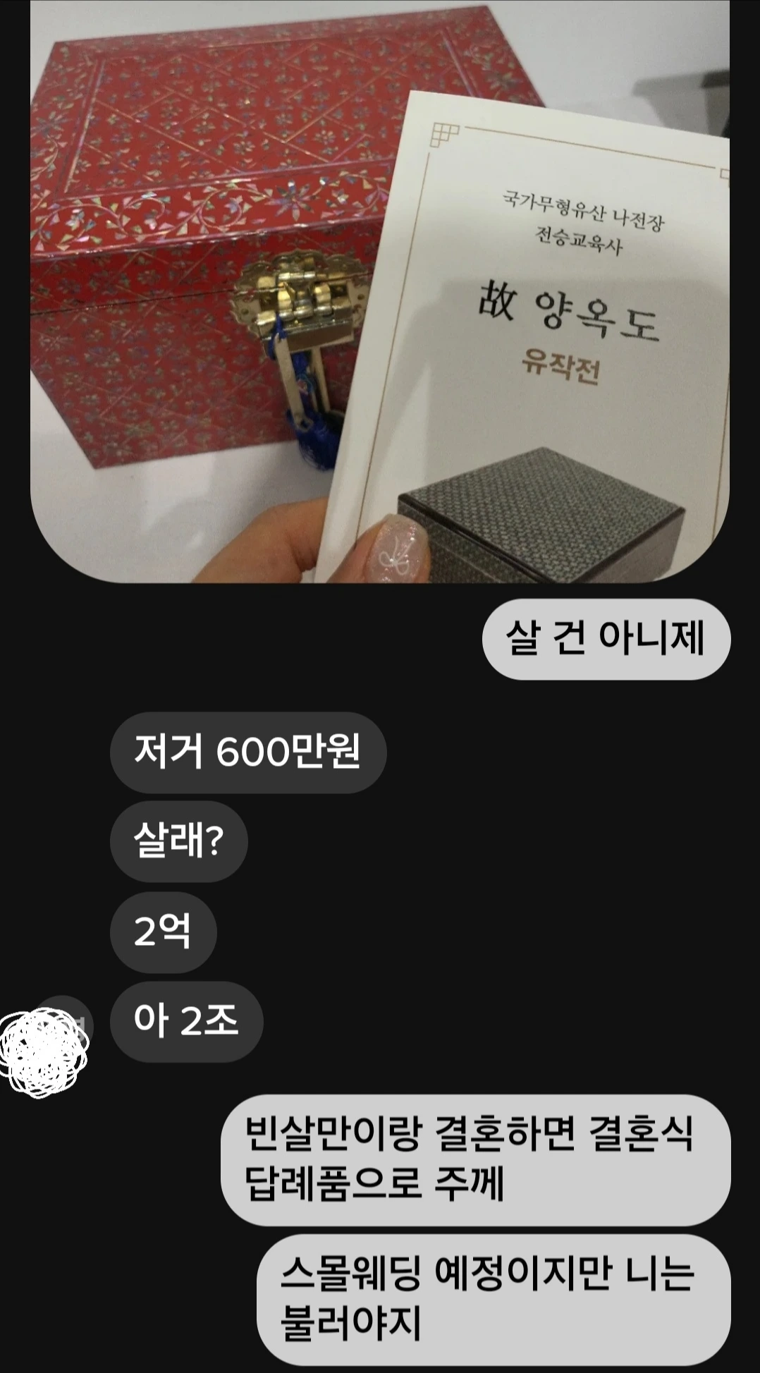"빈 살만씨, 정말 가까운 분들께만 보내는 초대장이니 나전장인이 만든 나전칠기 보석함에 인간문화재 서예가 선생님께 부탁해서 정성껏 준비하는 게 어떨까요?"