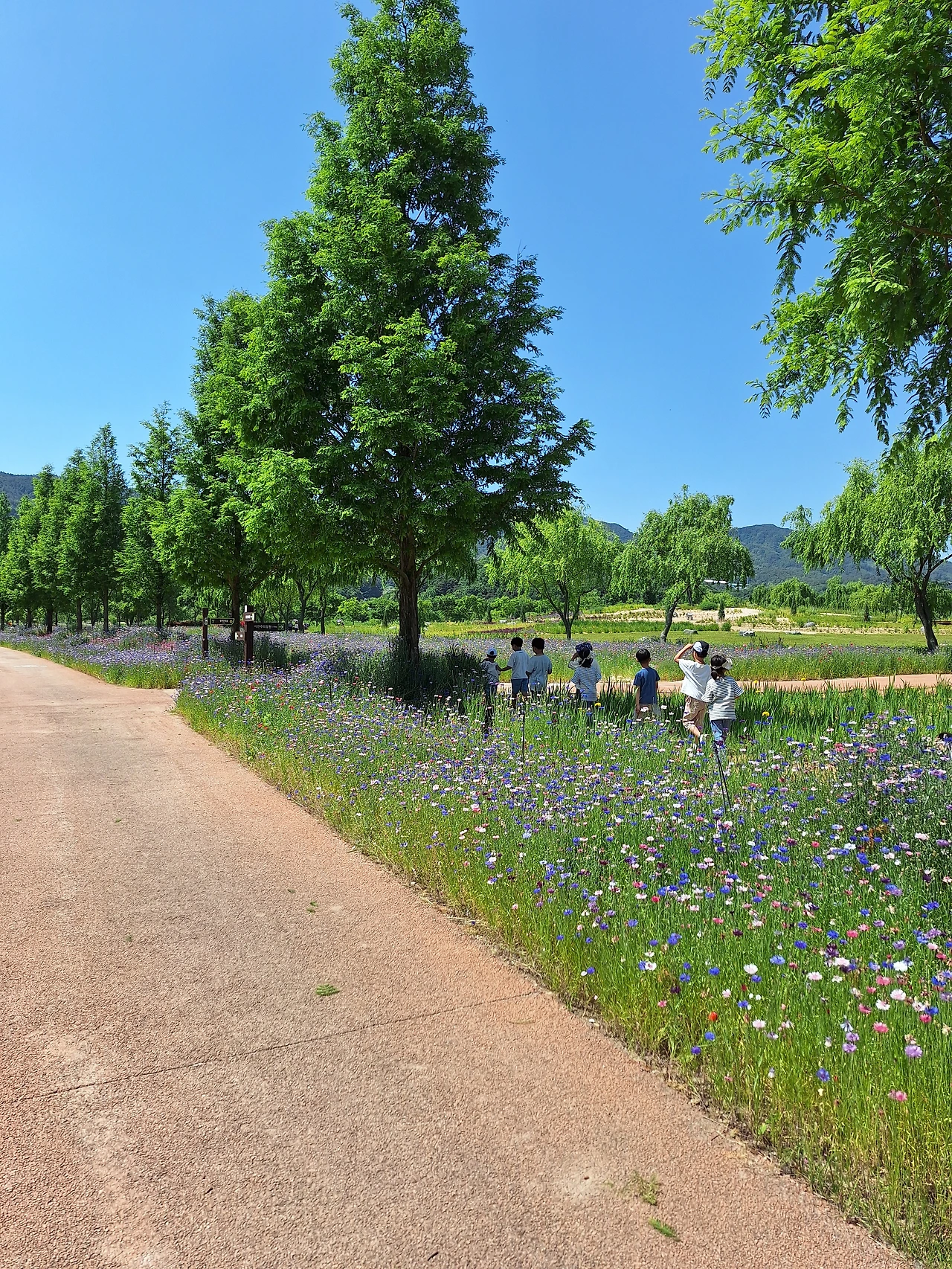 상쾌한 아침 공기를 마시며 수레국화가 곱게 핀 길을 걷는다.