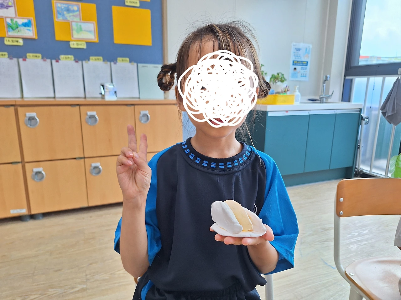 "선생님이 오늘 여러분한테 하얀 클레이를 줄 건데 이건 사인펜으로 색깔을 입히면 자기가 원하는 색으로 만들 수 있는 클레이예요. 원하는 색깔의 송편을 만들어봅시다."