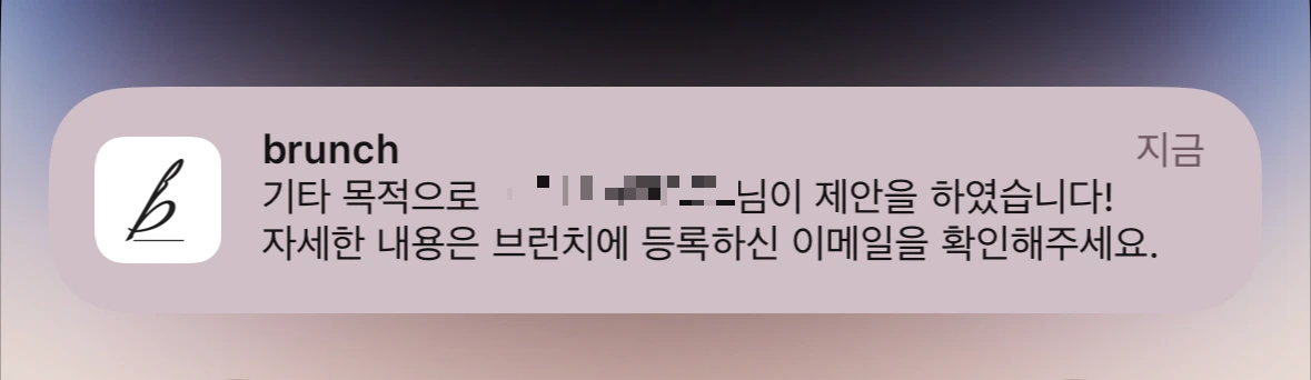 그러던 어느 날, 결국 내 상상은 현실이 되었다. 그날도 어김없이 퇴근을 한 뒤에 집에 바로 들어가지 않고 카페에서 브런치에 발행할 글을 쓰고 있었다. 근데 갑자기 폰에서 알람이 떠서 확인을 해봤더니, 새로운 제안이 들어왔다는 메시지가 떠 있었던 것이다. 아마 그 순간엔 심장이 약간은 두근거렸던 걸로 기억한다.
