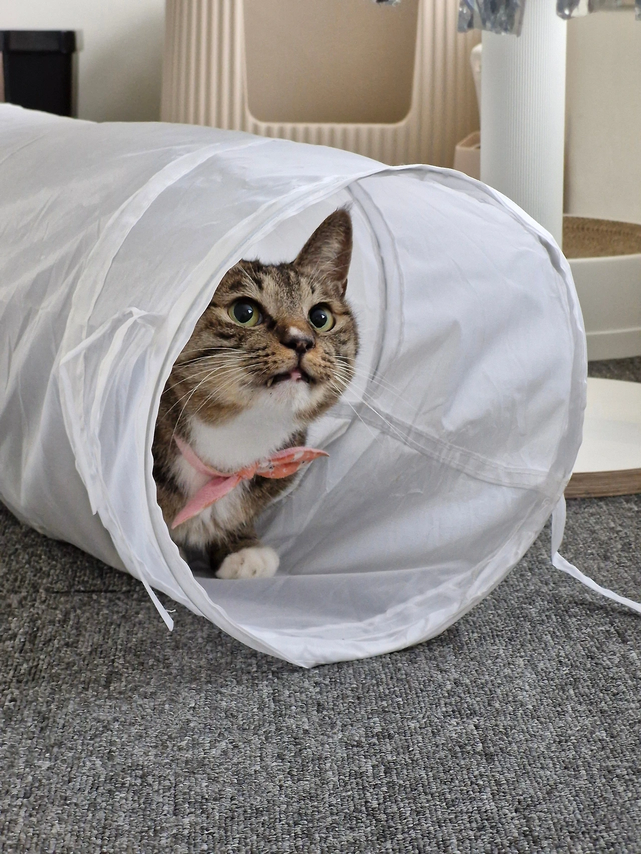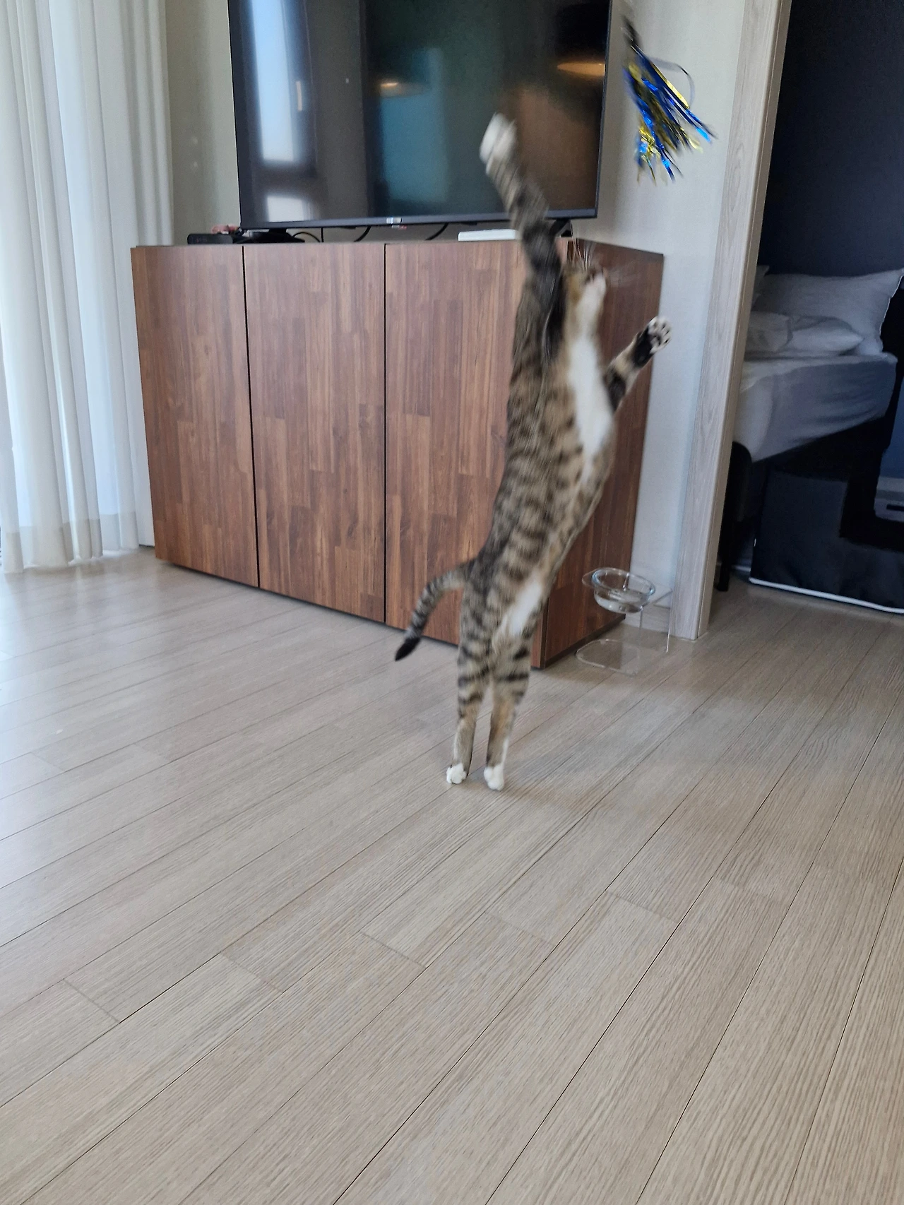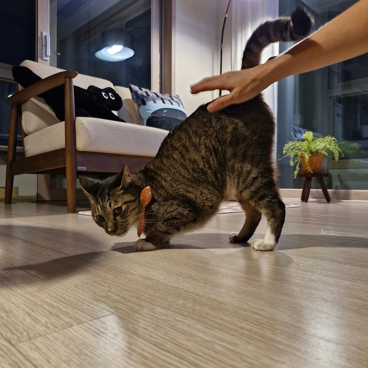 알밤이는 말도 많고 사냥 놀이도 참 좋아합니다. 하루종일 같이 있으면 얼굴보다 엉덩이를 더 많이 볼 정도로 궁디팡팡 역시 무척 좋아합니다.