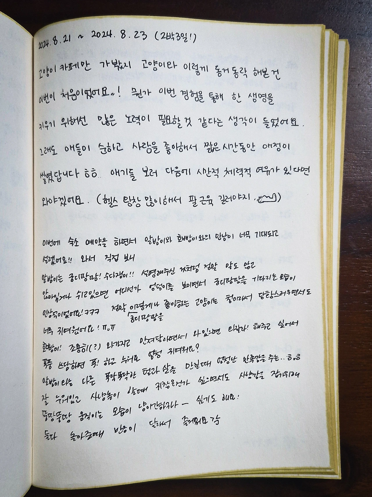 고양이 카페만 가봤지 고양이와 이렇게 동고동락 해본 건 이번이 처음이었어요! 뭔가 이번 경험을 통해 한 생명을 키우기 위해선 많은 노력이 필요할 것 같다는 생각이 들었어요. 그래도 애들이 순하고 사람을 좋아해서 짧은 시간 동안 애정이 쌓였답니다 ㅎㅎ 애기들 보러 다음에 시간적 체력적 여유가 있다면 와야겠어요. (헬스 왕창 많이 해서 팔 근육 길러야지)