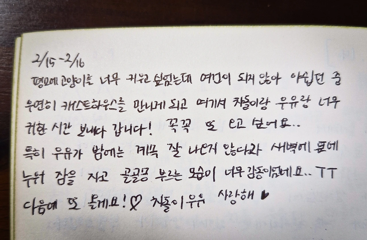 평소에 고양이를 너무 키우고 싶었는데, 여건이 되지 않아 아쉽던 중 우연히 캐스트하우스를 만나게 되고 여기서 차돌이랑 우유랑 너무 귀한 시간 보내다 갑니다! 꼭꼭 또 오고 싶어요..