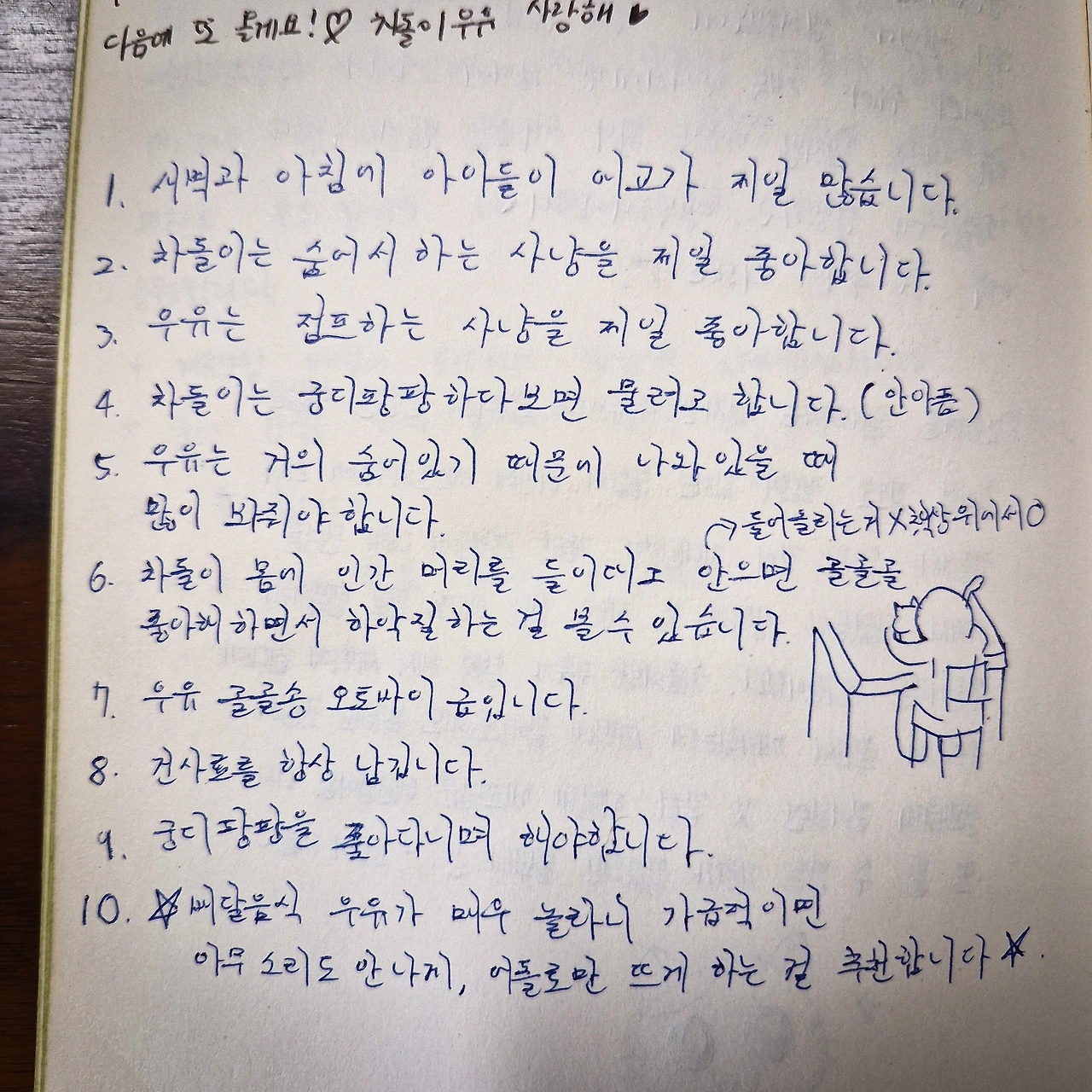 10. * 배달음식 우유가 매우 놀라서 가급적이면 아무 소리도 안 나게, 어플로만 뜨게 하는 걸 추천합니다. *