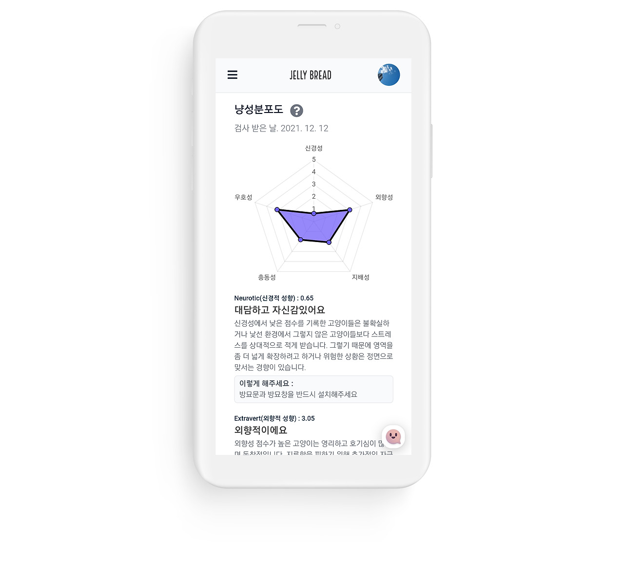 이 Cat 5를 유기묘 입양 플랫폼 개발 초기에 플랫폼 내에 탑재해 두었다. 연구진들이 집필한 영문 논문을 읽고 분석하고, 통계학을 배운 다음, 파이썬 pandas와 numpy 라이브러리를 활용해 고양이 성격 검사를 만들었다.