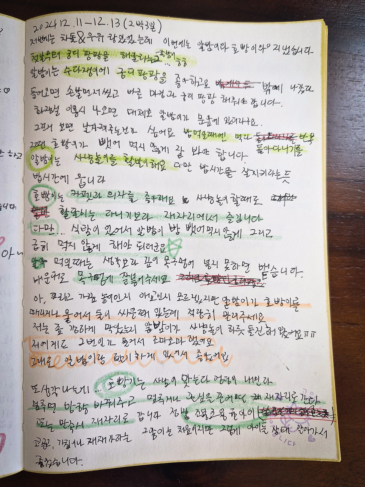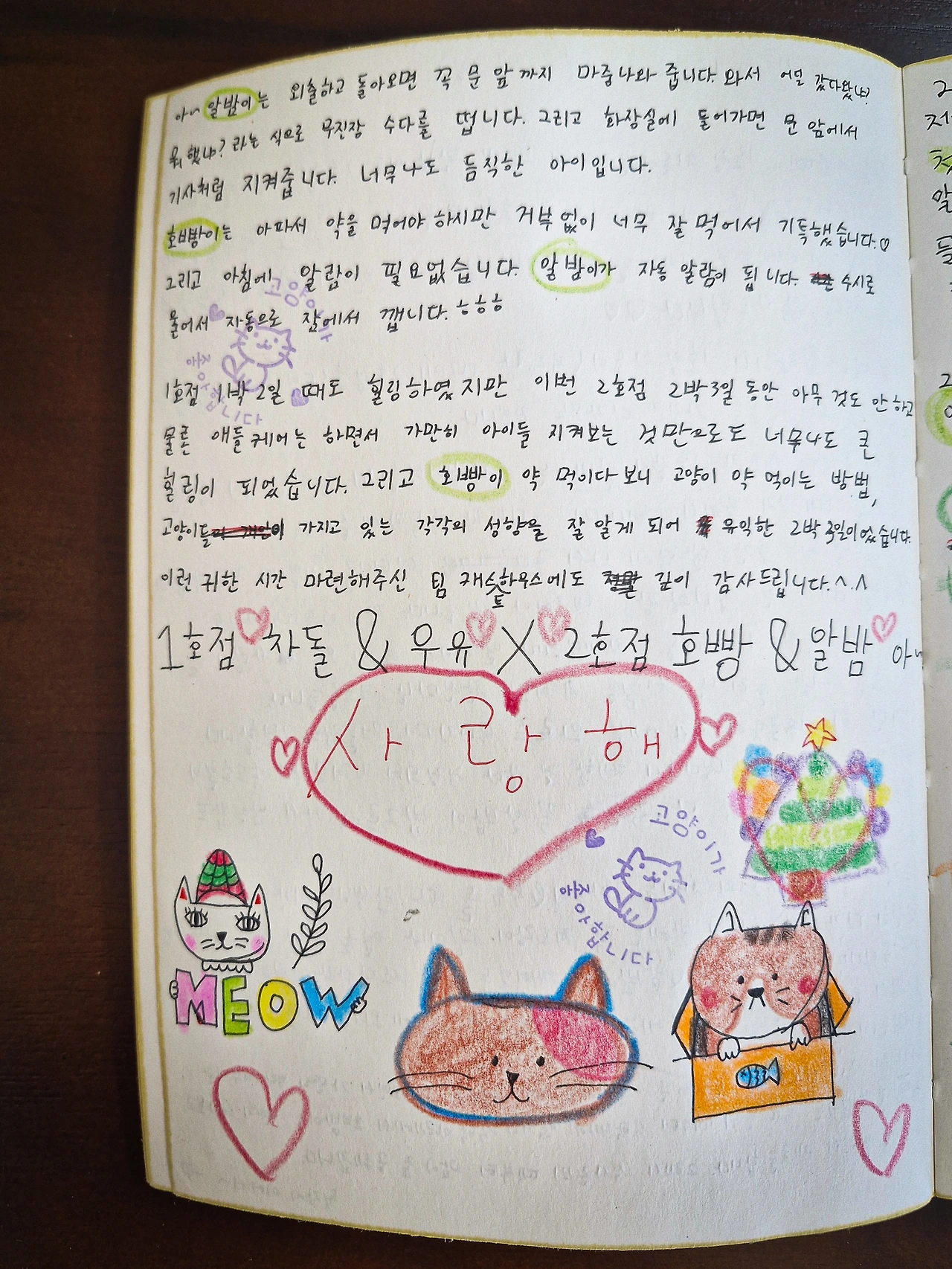 1호점 1박 2일 때도 힐링하였지만 이번 2호점 2박 2일 동안 아무것도 안 하고 물론 애들 케어는 하면서 가만히 아이들 지켜보는 것만으로도 너무나 큰 힐링이 되었습니다. 그리고 호빵이 약 먹이다 보니 고양이 약 먹이는 방법, 고양이들이 가지고 있는 각각의 성향을 잘 알게 되어 유익한 2박 3일이었습니다. 이런 귀한 시간 마련해 주신 팀 캐스트하우스에도 깊이 감사드립니다. ^.^