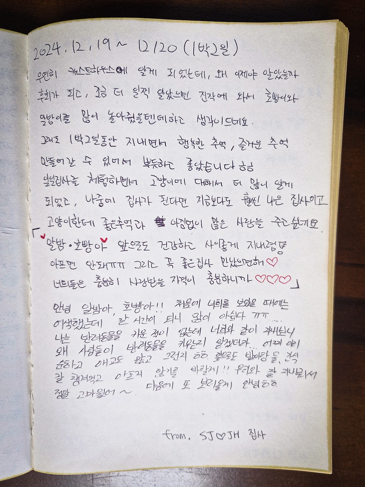 안녕 알밤아, 호빵아!! 처음에 너희를 보았을 때에는 어색했는데, 갈 시간이 되니 많이 아쉽다 ㅠㅠ... 나는 반려동물을 키운 적이 없는데 너희와 같이 지내보니 왜 사람들이 반려동물을 키우는지 알겠더라... 어찌 이리 순하고 애교도 많고 그런지 ㅎㅎ 앞으로도 밥이랑 물, 간식 잘 챙겨 먹고 아프지 않기를 바랄게!! 우리와 잘 지내줘서 정말 고마웠어~ 다음에 또 보러 올게. 안녕 ㅎㅎ