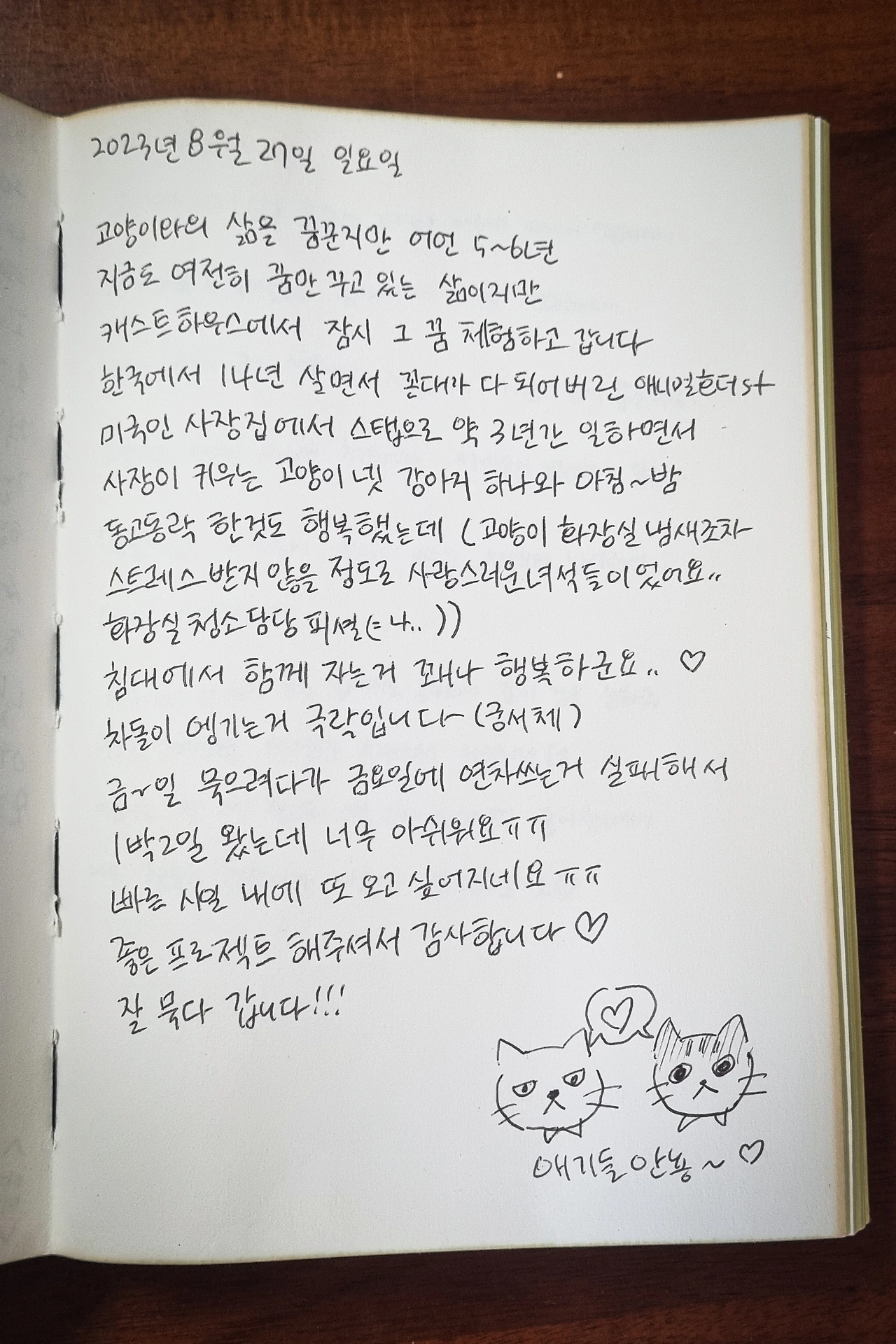 고양이와의 삶을 꿈꾼 지만 어언 5~6년 지금도 여전히 꿈만 꾸고 있는 삶이지만 캐스트하우스에서 잠시 그 꿈 체험하고 갑니다.