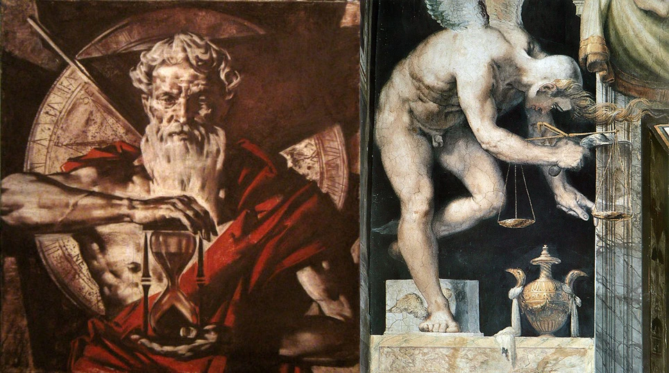 (좌) 객관적인 시간을 관장하는 그리스의 크로노스 신. (우) '기회의 신' 이라고도 불리우는 그리스의 카이로스 신.