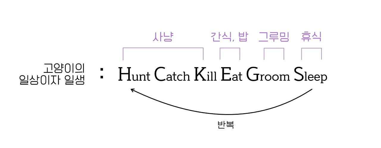 야생의 고양잇과 동물들은 사냥감이 나타나면 한참을 관찰하며 쫓아다니다가(hunt) 타이밍이 되었을 때 사냥감을 잡은(catch) 후, 이빨과 발톱으로 죽인다(kill)