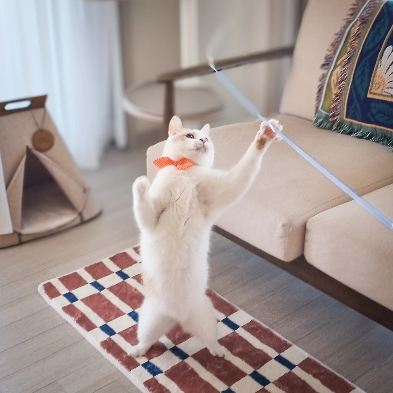 이러한 과정 없이 잡힐 듯 말 듯 요란스럽게 장난감을 고양이 눈앞에서 흔드는 것은 사냥이 아닐뿐더러, 고양이의 다양한 문제 행동 교정에 별반 도움이 되지 않는다.