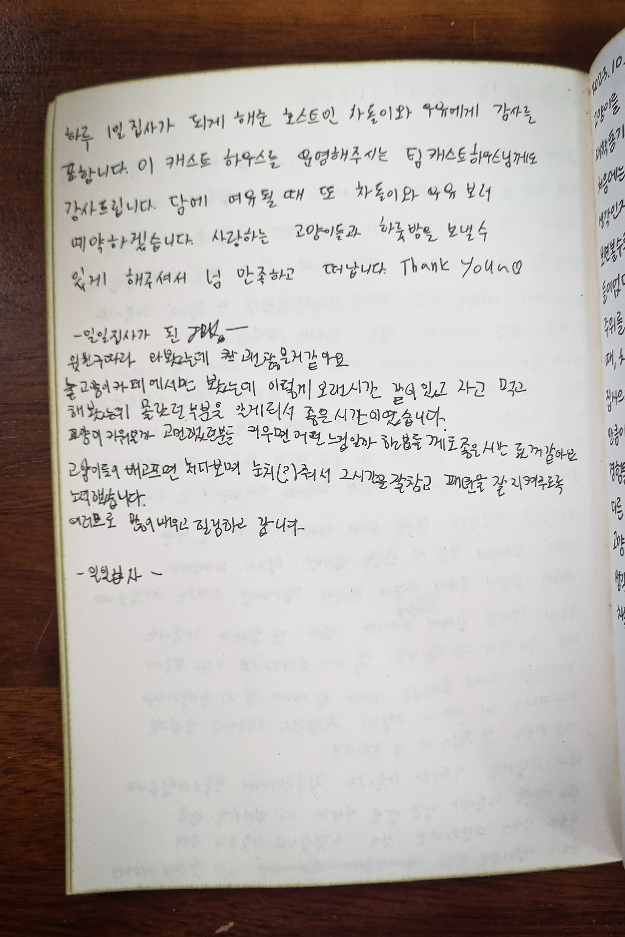 하루 1일 집사가 되게 해준 호스트인 차돌이와 우유에게 감사를 표합니다. 이 캐스트하우스를 운영해 주시는 팀 캐스트하우스님께도 감사드립니다. 담에 여유될 때 또 차돌이와 우유 보러 예약하겠습니다. 사랑하는 고양이들과 하룻밤을 보낼 수 있게 해 주셔서 너무 만족하고 떠납니다.