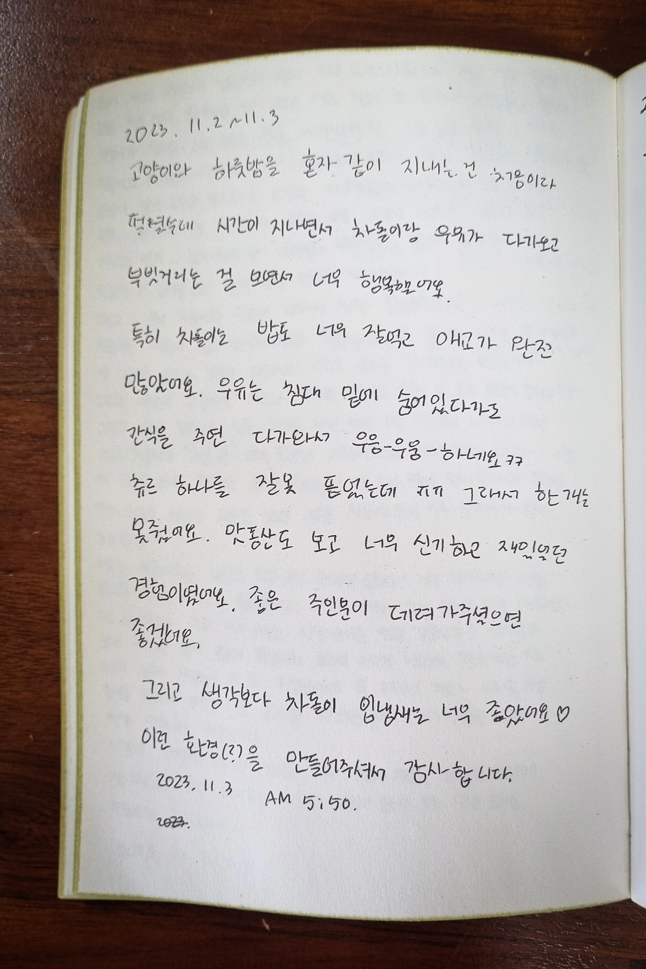 고양이와 하룻밤을 혼자 같이 지내는 건 처음이라 떨렸는데 시간이 지나면서 차돌이랑 우유가 다가오고 부빗거리는 걸 보면서 너무 행복했어요.