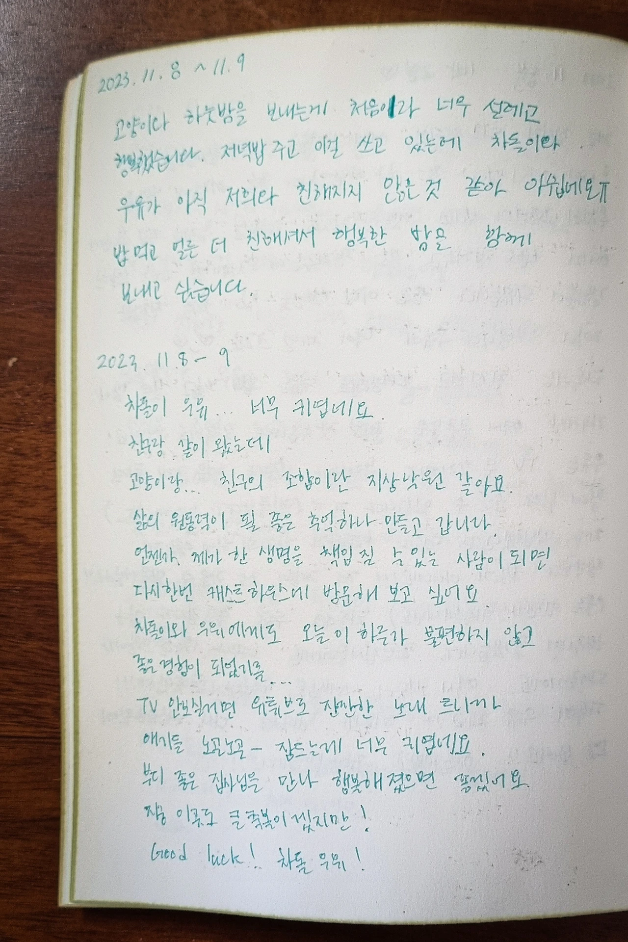 고양이와 하룻밤을 보내는 게 처음이라 너무 설레고 행복했습니다. 저녁밥 주고 이걸 쓰고 있는데 차돌이와 우유가 아직 저희와 친해지지 않은 것 같아 아쉽네요 ㅠ