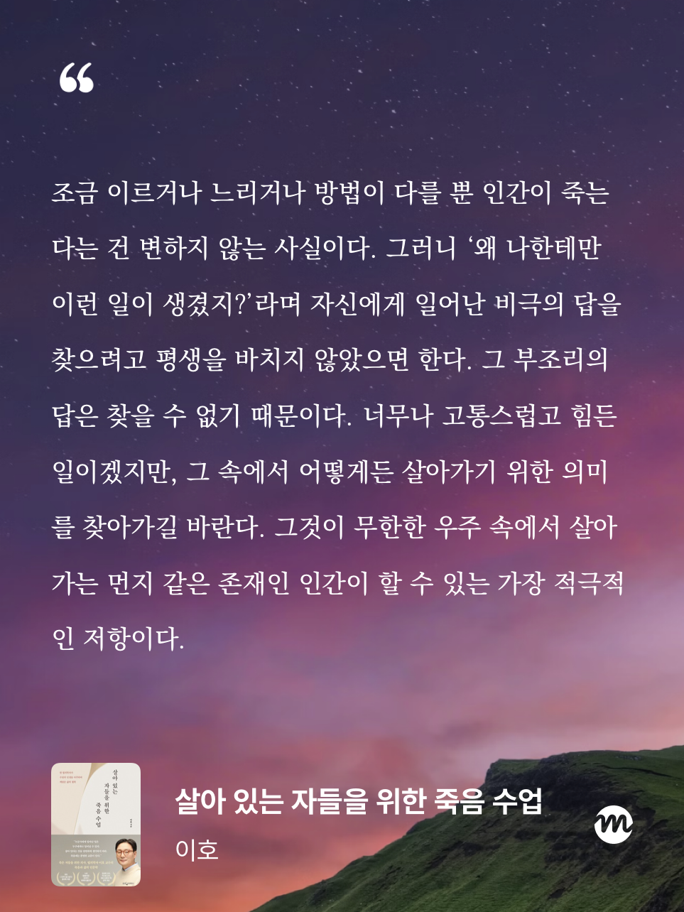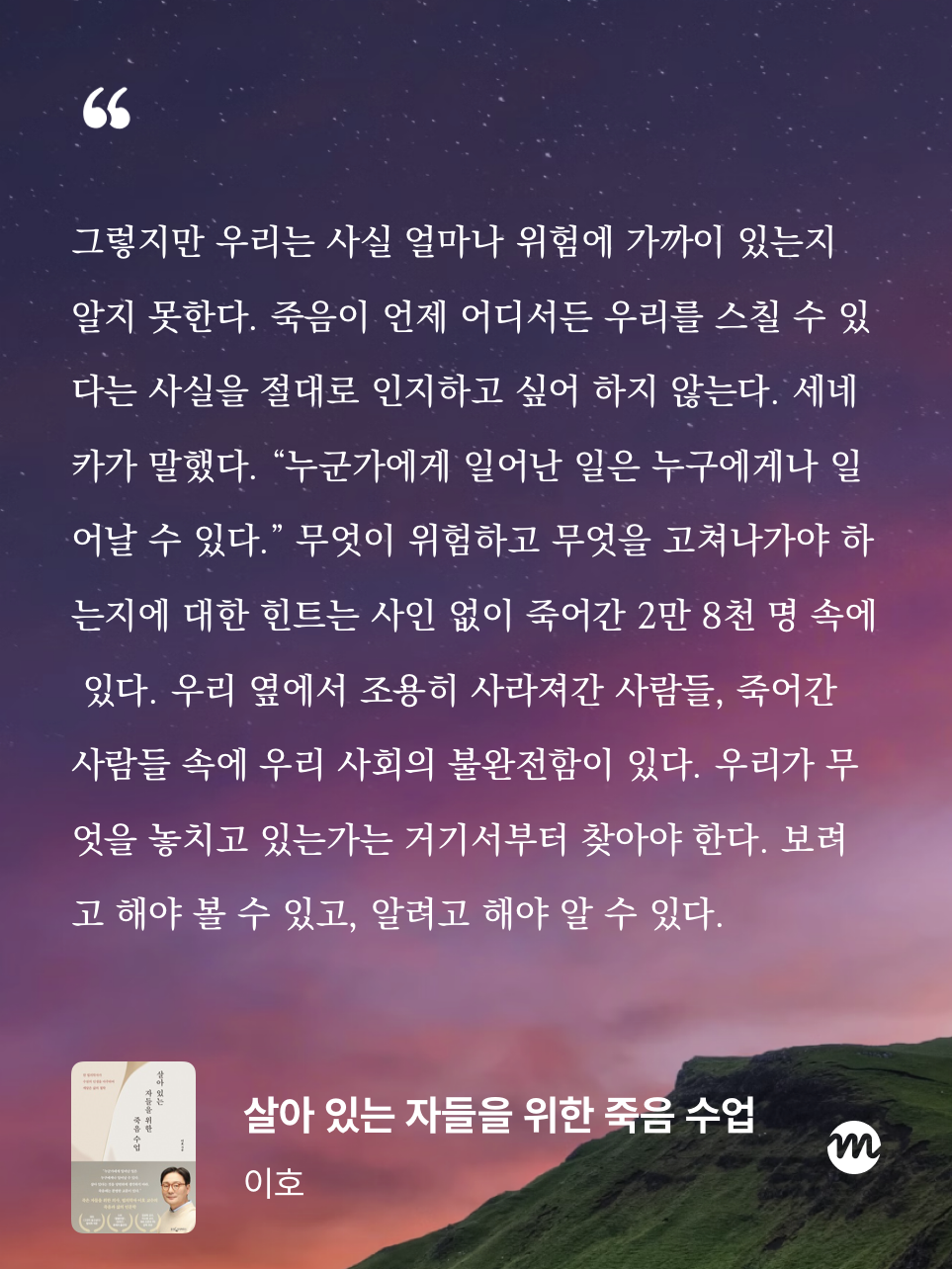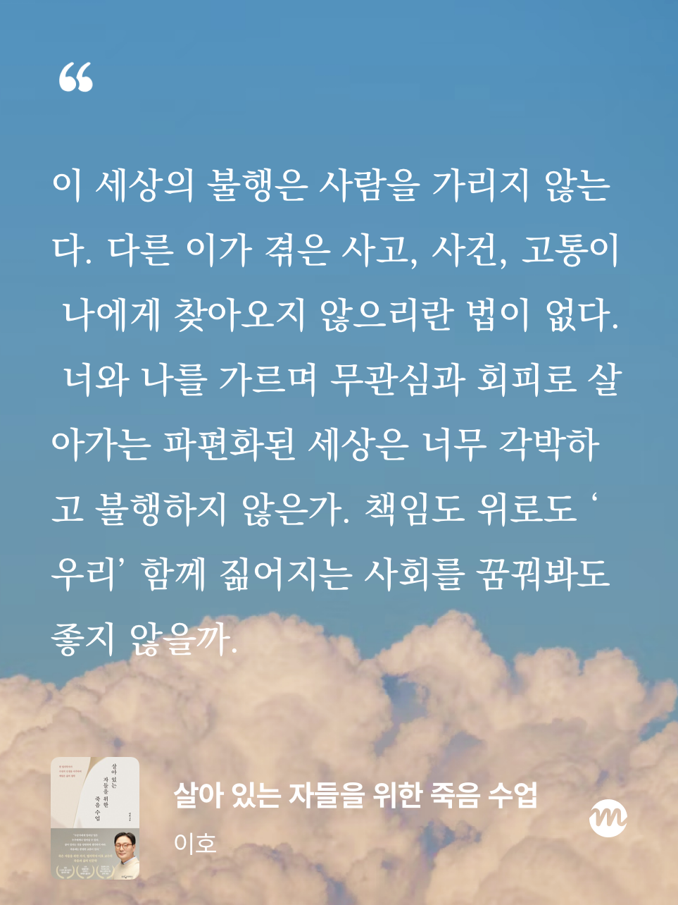우리가 지닌 이 몸조차도 딱 한순간만 소유할 뿐이다. 죽은 이들을 보다 보면 더욱 그런 생각이 든다. 내 몸조차도 잠시 소유할 수 있을 뿐인데 다른 것은 그에 비할 바가 아니다. 그렇다면 돈, 학벌, 명예, 외모… 그 무엇에도 그리 집착할 필요가 없지 않을까. - <살아 있는 자들을 위한 죽음 수업>, 이호 - 밀리의 서재