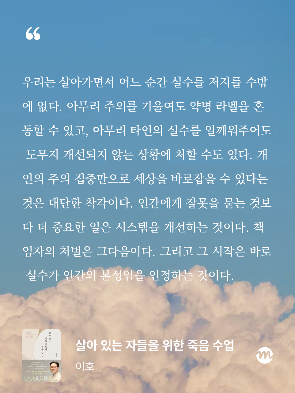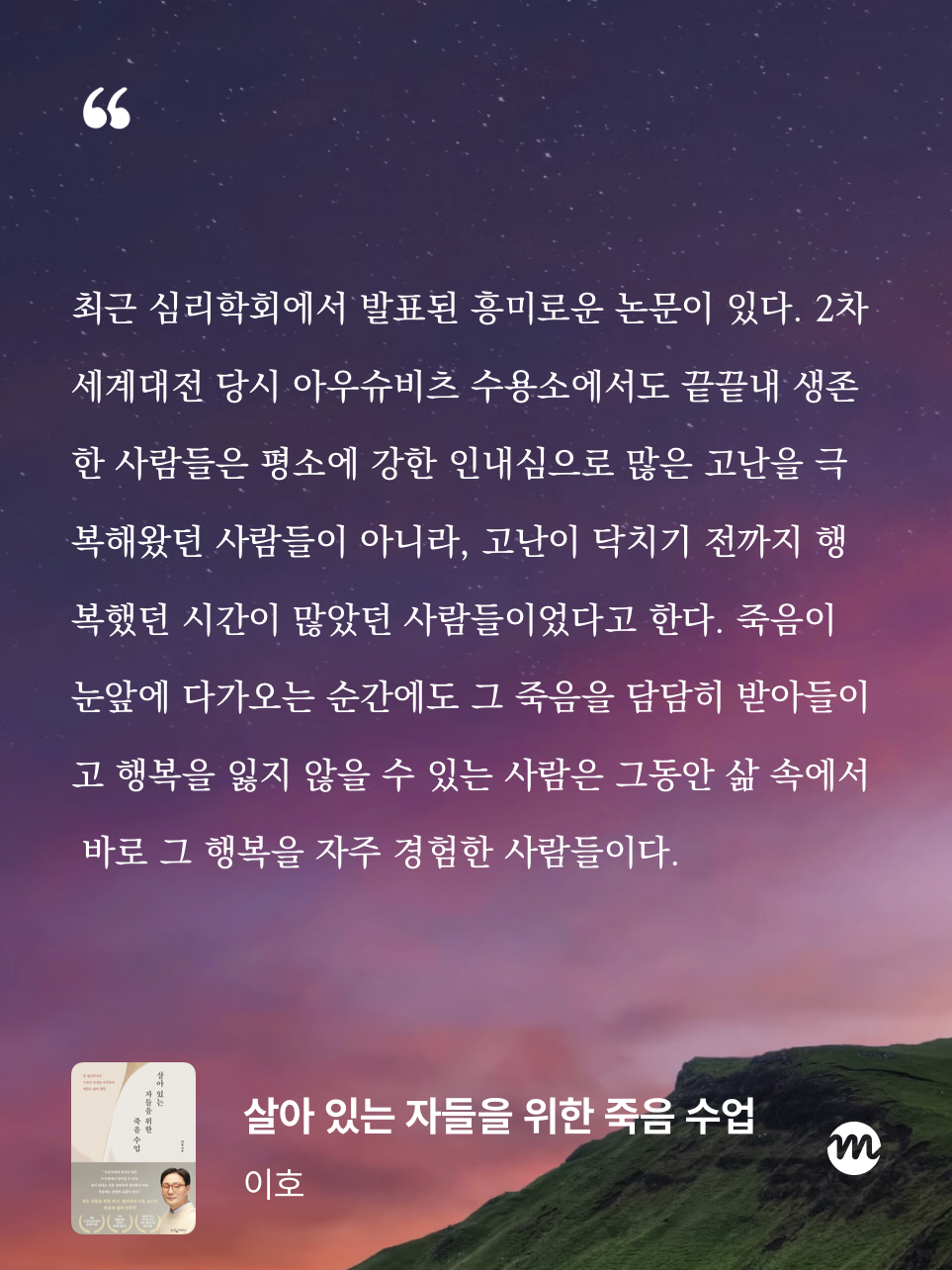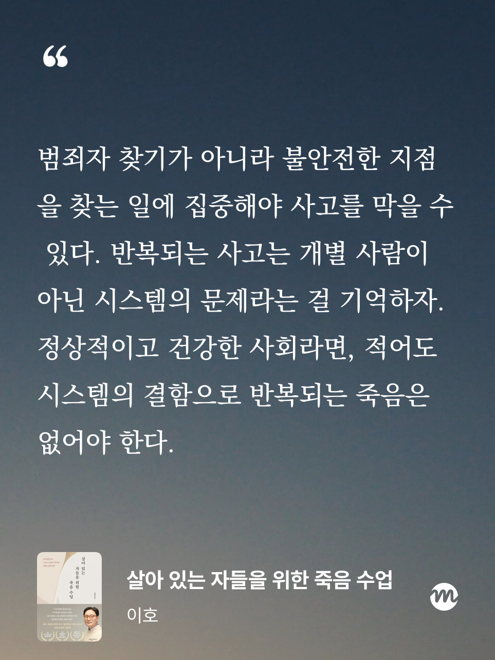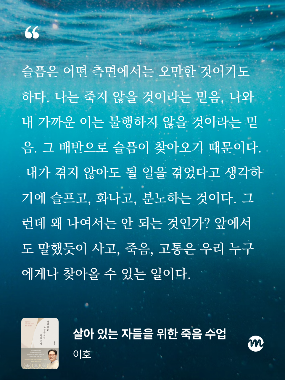 우리가 지닌 이 몸조차도 딱 한순간만 소유할 뿐이다. 죽은 이들을 보다 보면 더욱 그런 생각이 든다. 내 몸조차도 잠시 소유할 수 있을 뿐인데 다른 것은 그에 비할 바가 아니다. 그렇다면 돈, 학벌, 명예, 외모… 그 무엇에도 그리 집착할 필요가 없지 않을까. - <살아 있는 자들을 위한 죽음 수업>, 이호 - 밀리의 서재