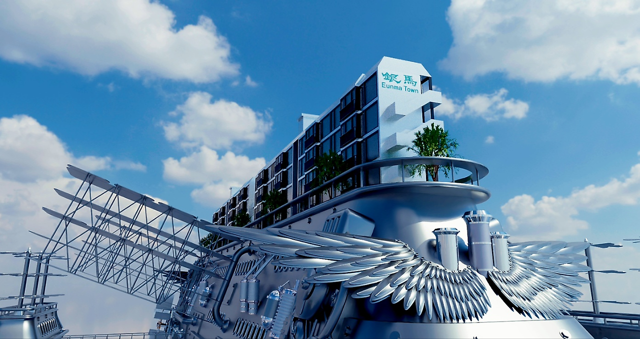 적힌 팻말을 보니 역시 은마아파트가 맞았다. 어쩌면 이건 은마아파트가 꾸는 꿈일지도 모르겠다. 멋진 비행선이 되어 하늘을 나는 꿈. 현실의 은마아파트는 홀로 재건축을 하지 못해 조롱의 대상이 되곤 했다. 늘 새롭게 단장하는 다른 아파트들이 부러웠을 것이다. 이런 모습으로 하늘에서 나타난다면 모두가 우러러보지 않을까?