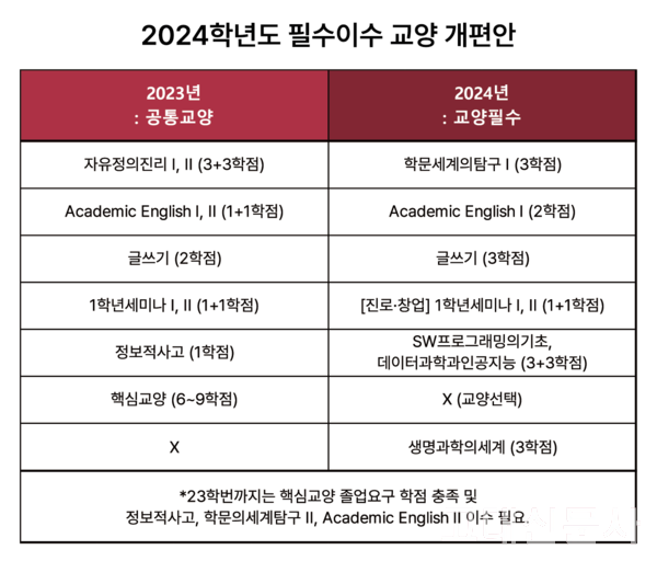 Source: 고대신문이는 지방 소재 대학만의 일이 결코 아니다. 필자가 재학 중인 고려대학교에서도 인문학의 입지는 점차 줄어들고 있기 때문이다. 고려대학교는 2024년부터 영어 수업을 담당하던 'Academic English'와 인문학적 토론 과목인 '자유정의 진리 2'가 필수 과목에서 해제되었다. '윤리와 사상', '문학과 예술' 등을 다루는 핵심교양 역시 소멸하였고 대신 '생명과학의 세계'와 'SW프로그래밍'의 기초가 필수 과목으로 지정됐다. 전반적으로 이과 과목이 우세를 점하는 모양새다.