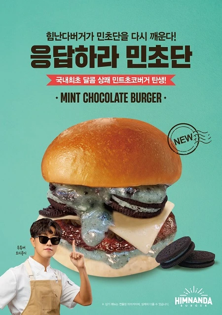 이제 신기할 것도 없다. 민초 떡볶이와 치킨이 있는데 햄버거는 당연히 있지 않을까. 물론 당연히 있다. 햄버거 체인점 힘난다 버거에서는 2022년 10월 12일을 기해 민트초코 햄버거를 전국에 판매한다고 밝혔다. 이들은 소비자를 대상으로 여러 이벤트를 진행하는 등 사전 준비에 만전을 가한 나름 주력 상품인 셈이다.