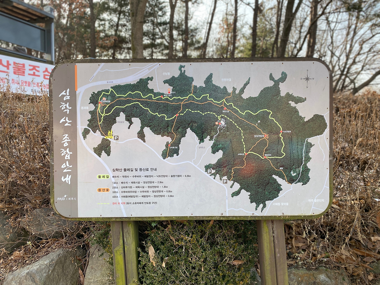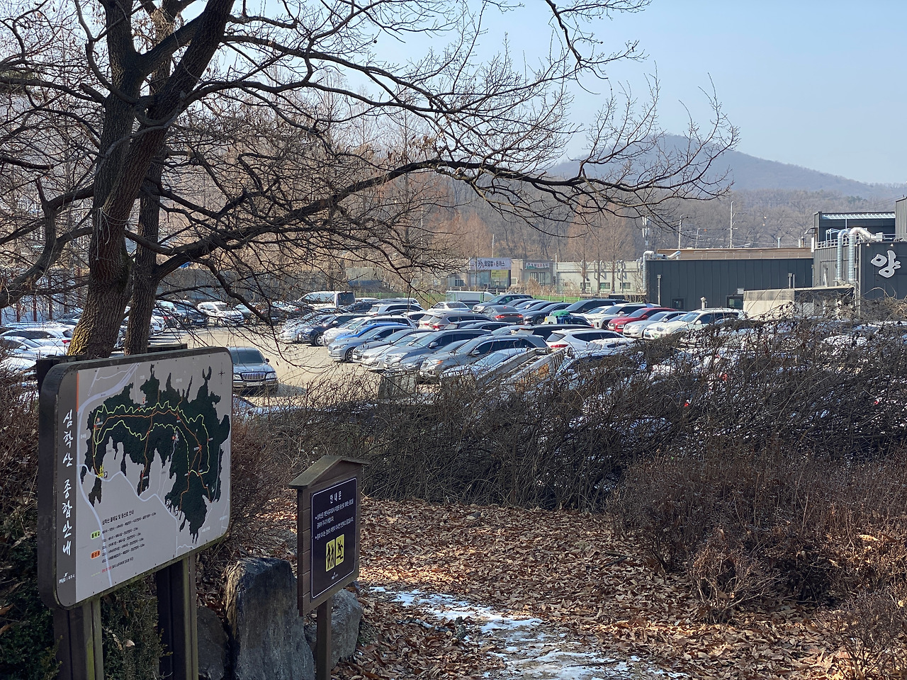 누군가 심학산을 다녀온 경험을 블로그에 올려놓은 걸 보고 대충 어디로 가야 할지 머릿속에 그리며 산 입구 주차장에 도착했다. 연휴 마지막 날이라 그런지 만석이다. 겨우 한 곳을 발견해 주차를 하고 산 입구에서 등산 코스를 봤다. 둘레길이 있고 등산길이 있었는데 처음엔 가볍게 둘레길을 한 바퀴 돌고 오려고 했지만 산 초입 오르막 길을 걷다 보니 정상을 가보고 싶다는 생각이 들었다. 심학산이 아주 높은 산도 아니어서 한 번 가보자고 생각했다.